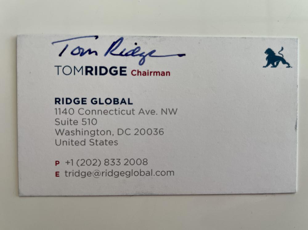 Former United States Secretary of Homeland Security Tom Ridge signed business card