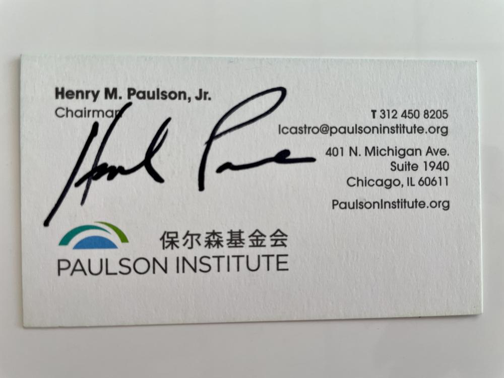 Former United States Secretary of the Treasury Henry Paulson signed business card