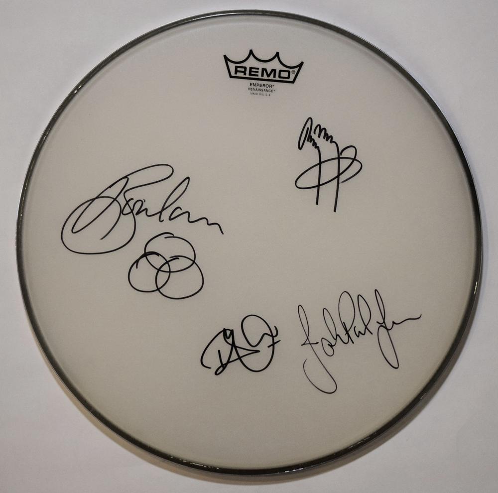 Led Zeppelin 14 Inch Drumhead. Signed: Jimmy Page, John Paul Jones, Robert Plant, and Jason Bonham.