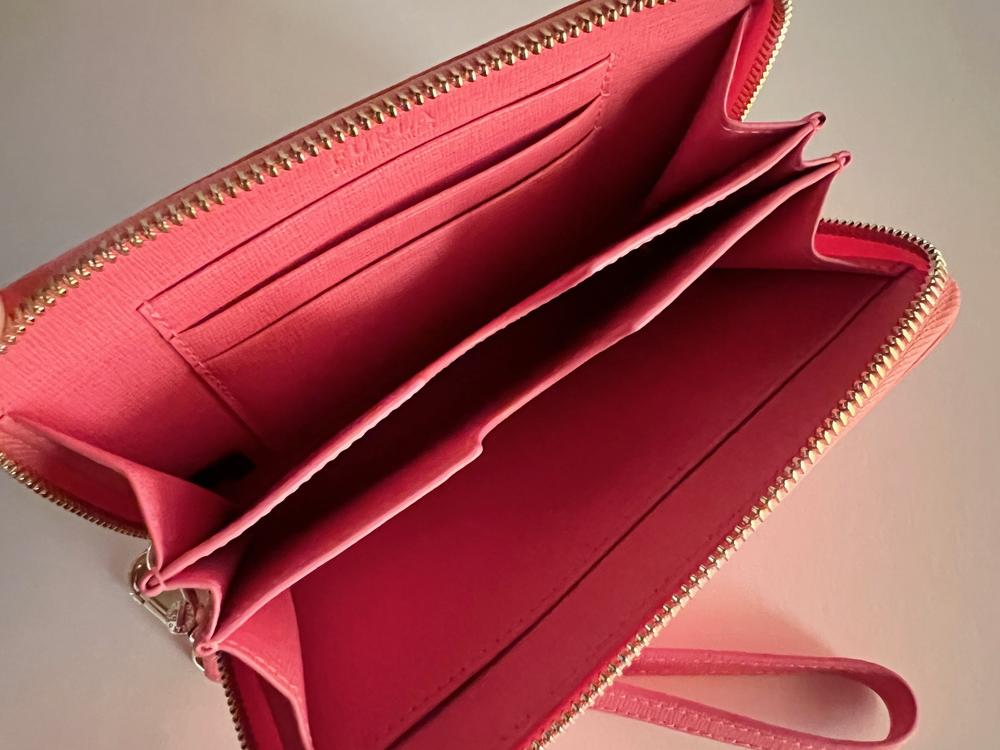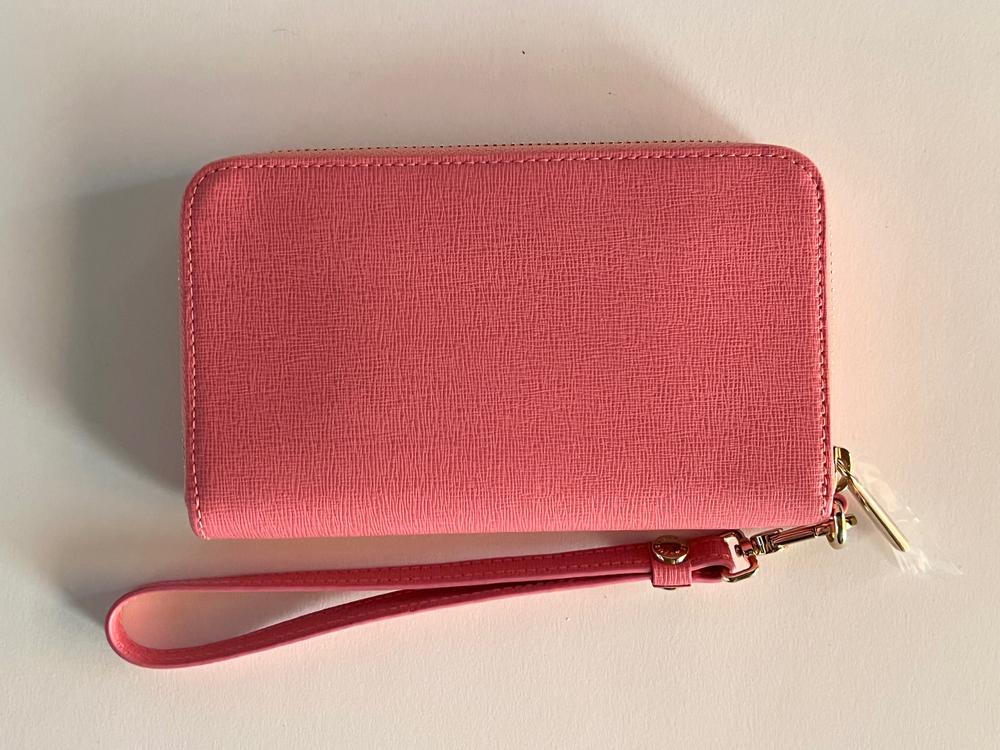 Furla Babylon L zip around wallet/wristlet in Peonia leather. High quality embossed leather with 4 credit card slots, 3 separated inner compartments, and removable wrist strap. Brand new with tags in original box with dustbag