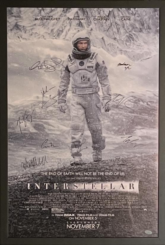 Interstellar cast signed movie poster autographed by Matthew McConaughey, Christopher Nolan, Ellen Burstyn, Anne Hathaway, Wes Bentley, Michael Caine, David Gyasi, Matt Damon, Collette Wolfe, John Lithgow, Mackenzie Foy and Timothee Chalamet, 26x38 inches