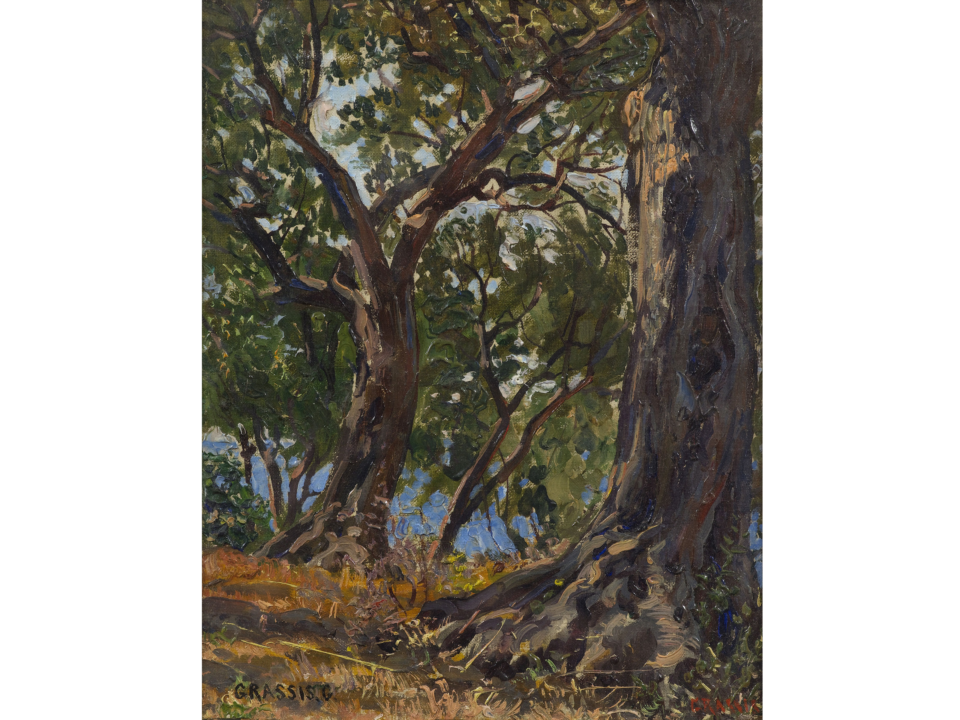 Giuseppe Grassis (Torino 1870-1949) Tronco d'ulivo Olio su cartone telato Pubblicato su Giuseppe Grassis Pittore fra Piemonte e Liguria "1870-1949", Vitaliano Rocchiero, 1984, tav. XX Misure 27.6x21.3 cm