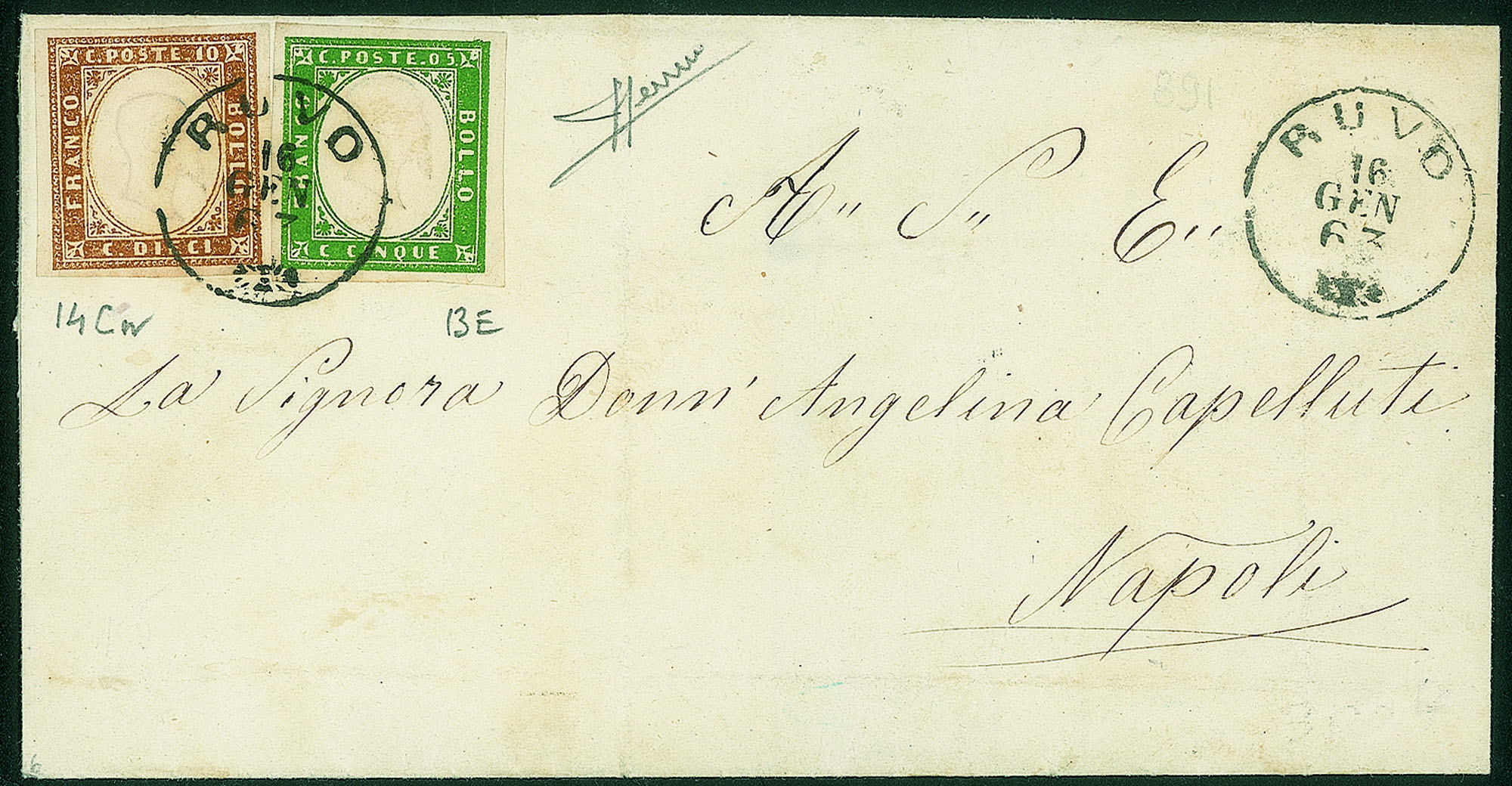 Antichi Stati Italiani - Sardegna - Lettera da Ruvo 16.1.63 affrancata con 10 cent più 5 cent (14Cn + 13E)Ben marginati - ex coll. Provera - Sorani