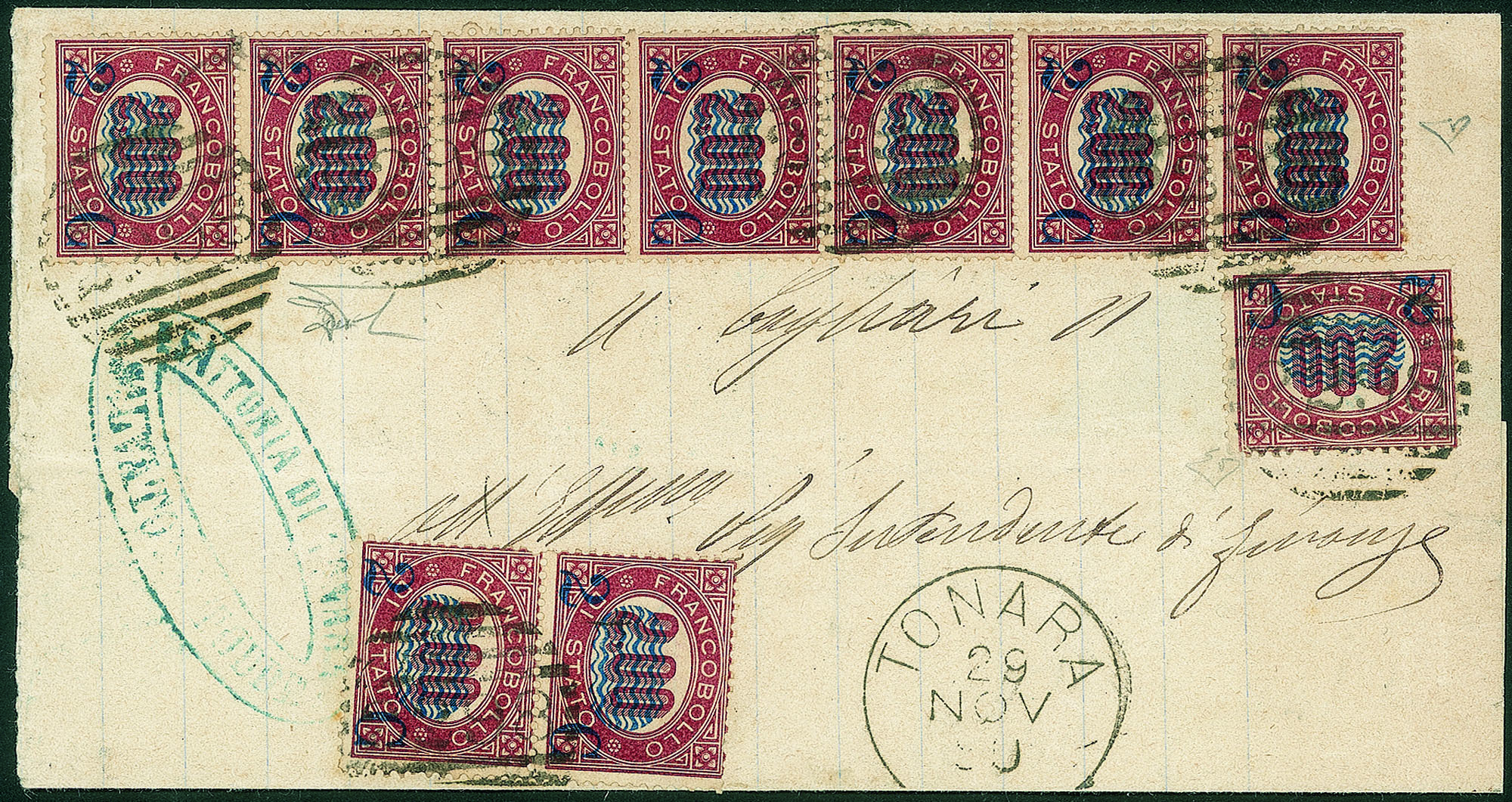Regno - Vittorio Emanuele II - Striscia di sette + coppia + singolo del 2 cent su 2 lire lacca scuro (34)