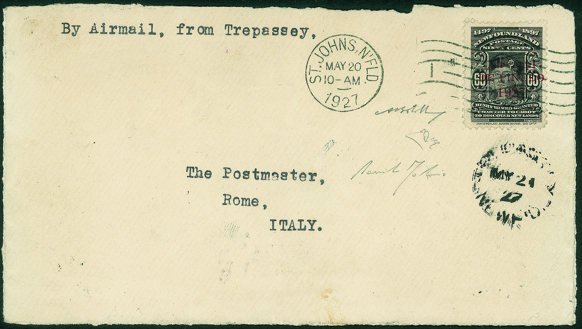 Europa e Oltremare - Terranova - Frontespizio di busta della Crociera dell'Atlantico del Santa Maria del Colonnello Francesco De Pinedo 8.2/25.6 1927 (Longhi 1641)Esemplare del 60 cent soprastampato (Yvert 4) annullato con timbro meccanico St. Johns Ntld 20.5.27 + timbro Trepassey del 21.5.27 su busta - molto bello e raro - cert. finanziario Bolaffi 100% + cert. E. Diena + cert. oro Fabris
