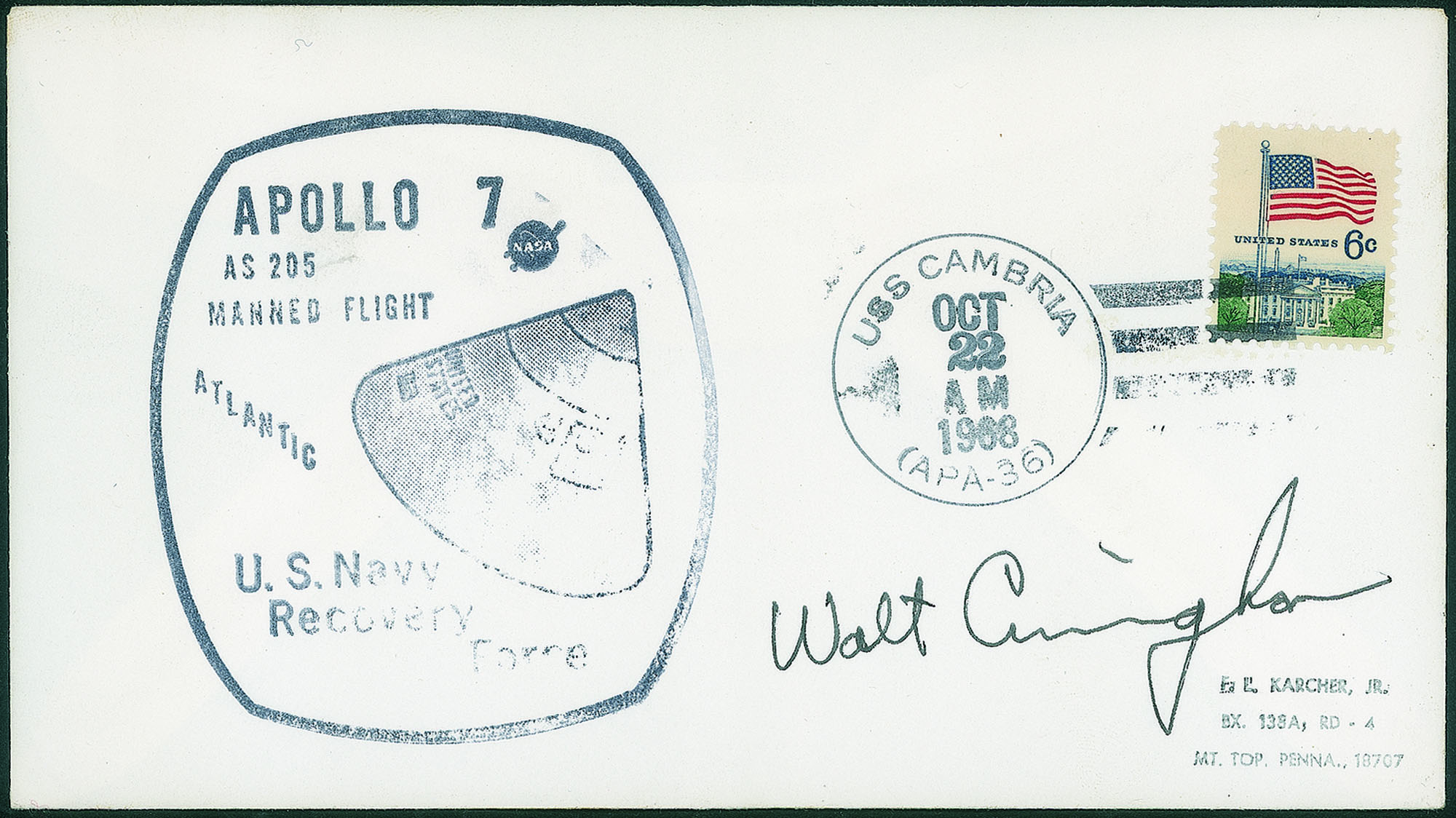 Collezione Spazio - Stati Uniti D'america - Apollo - 1968 - Apollo 7Busta commemorativa della missione Apollo 7 con annullo della nave di recupero il giorno dell'atterraggio 'USS Cambria 22 Oct 1968' con firma autografa di Walter Cunningham, membro insieme a Walter Schirra e Donn Eisele dell'equipaggio che effettuò 163 orbite complete intorno alla terra - molto bella