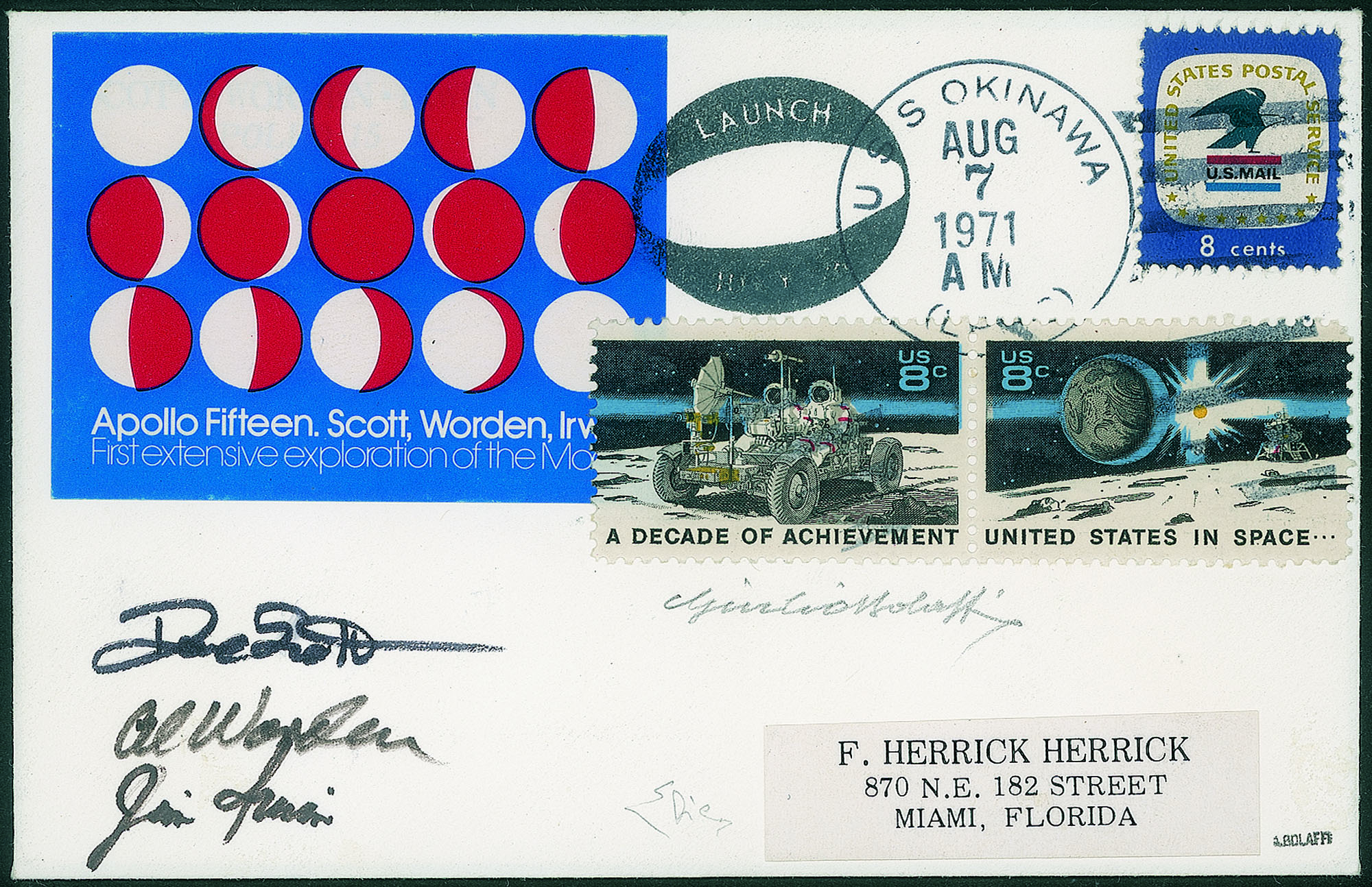 Collezione Spazio - Stati Uniti D'america - Apollo - 1971 - APOLLO 15Cosmogramma 'Fasi Lunari', una delle 144 stampate con un cachet che mostra le 15 fasi della Luna e trasportate in orbita attorno alla Luna durante la missione Apollo 15 (missione dello scandalo postale) - affrancata con dittico 'Un decennio di conquiste spaziali' più altro 8 cent - diversi annulli del lancio e del recupero in mare nell'oceano Pacifico da parte della portaerei USS Okinawa, e bollo rosso al verso 'Recovery Aug 7 1971' - firme autografe di David R.Scott, Alfred M.Worden e James B.lrwin - al verso manoscritto il numero di serie '242' - molto bella e di ottima qualità - cert. E. Diena + cert. G. Bolaffi con appendice