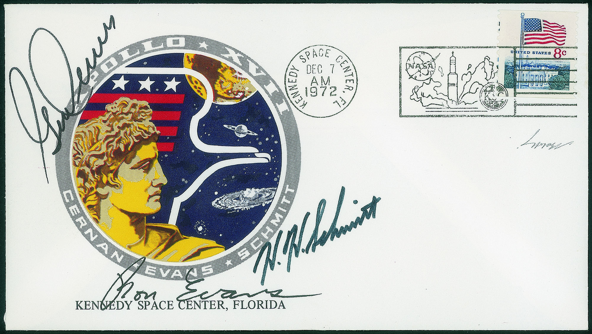 Collezione Spazio - Stati Uniti D'america - Apollo - 1972Busta con cachet della missione Apollo XVII con le firme autografe degli astronauti Cernan Evans e Schmitt annullata Kennedy Space Center 7.12.72 - molto bella - cert. finanziario Bolaffi 100%