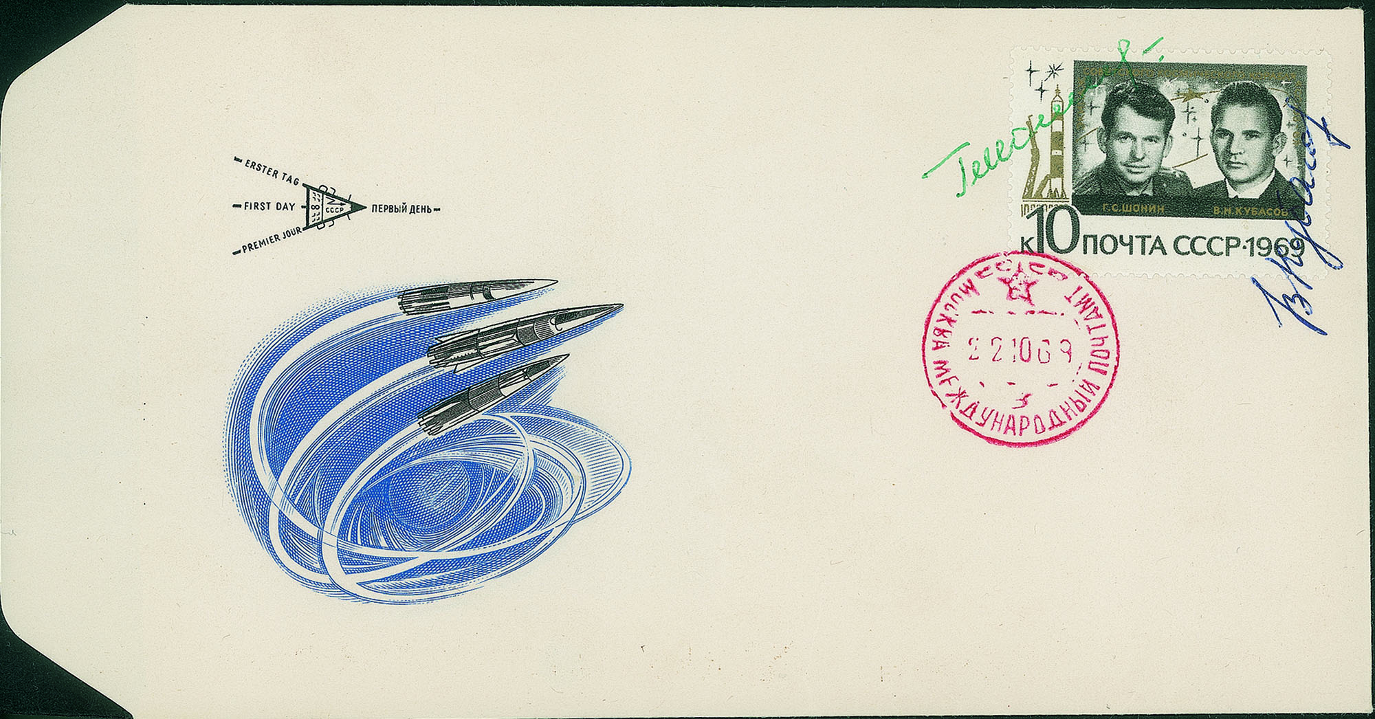 Collezione Spazio - Russia - Soyuz - 1969 - Soyuz 6Busta commemorativa annullata 22.10.69 con firme autografe dell'equipaggio V. Kubasov e G. Shonin