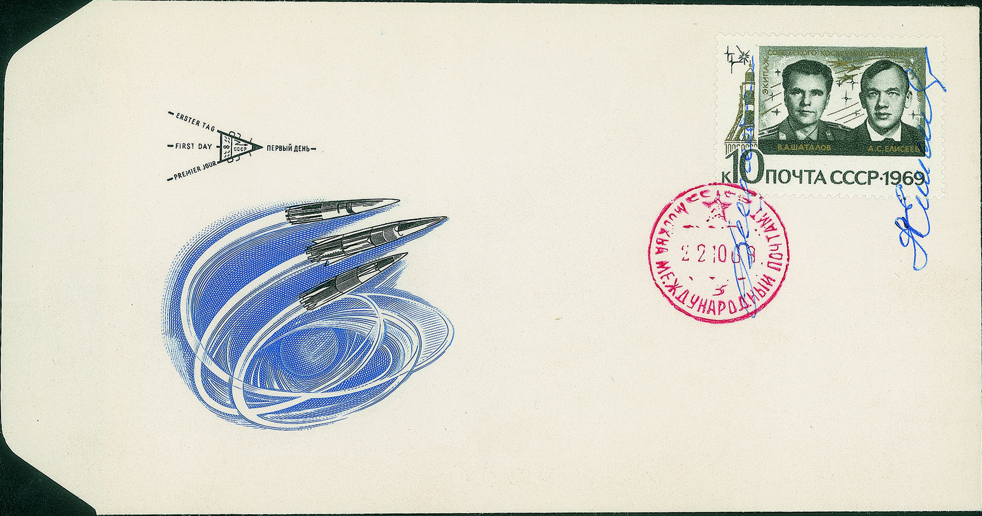 Collezione Spazio - Russia - Soyuz - 1969 - Soyuz 9Busta commemorativa annullata 22.10.69 con firme autografe dell'equipaggio V. Shatalov e A. Yeliseyev