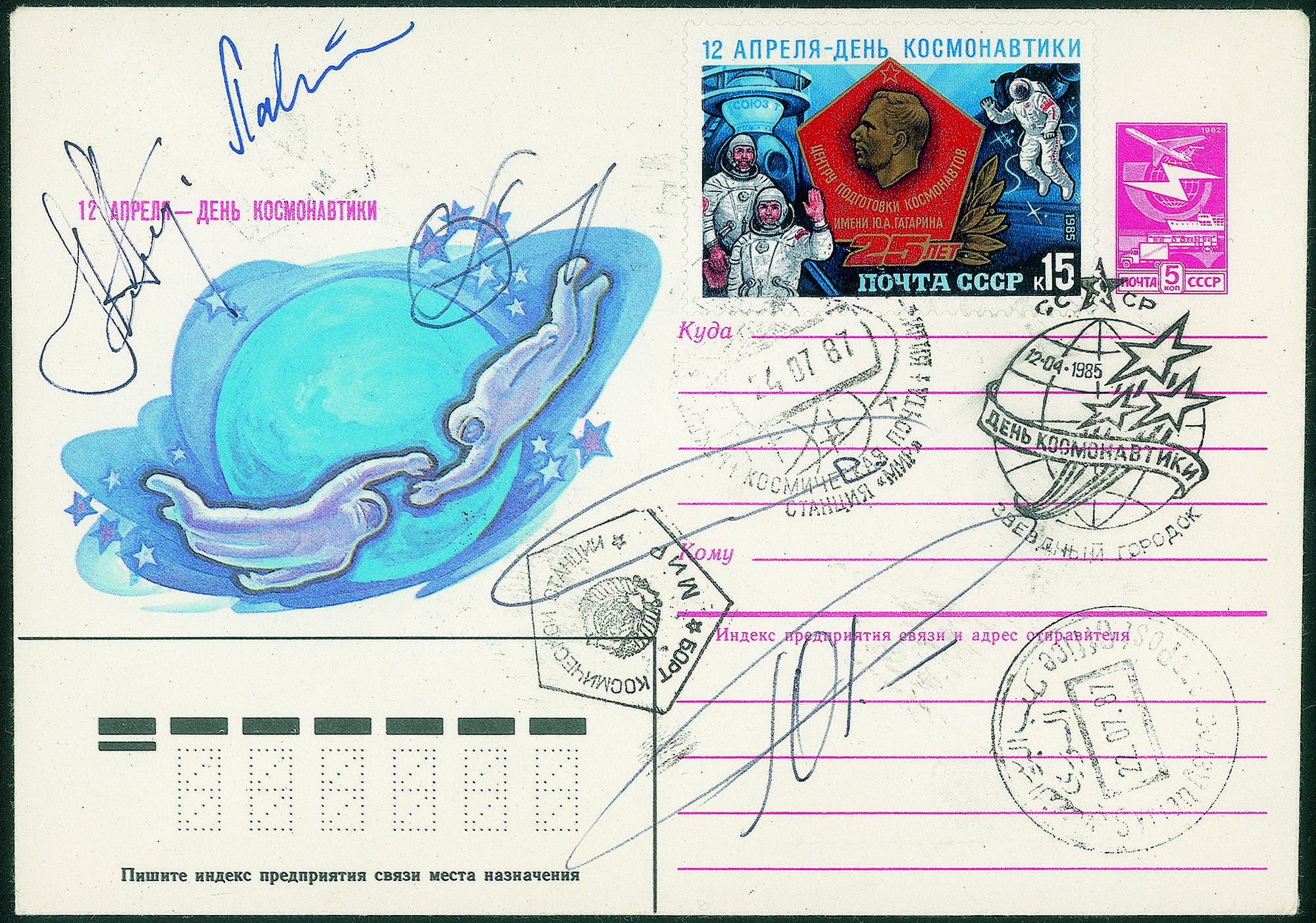 Collezione Spazio - Russia - Mir - 1987 - Stazione orbitale Mir - Soyuz TM-3Cosmogramma del volo sovietico-siriano Soyuz TM-3 - bollo pentagonale nero di bordo Mir, annullo ufficiale 'Siria 22.07.87', lancio, e sovietico-siriano 'CC*CP 24.07.87', commemorativo dell'aggancio Mir e del carattere internazionale del volo sovietico-siriano - firme autografe di Y.Romanenko e A.Laveikin (Soyuz TM-2 a bordo della stazione), A.Viktorenko, A.Alexandrov e M.Faris, Siria (Soyuz TM-3) - ottima qualità - cert. Kniga