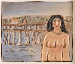 TABUSSO FRANCESCO Sesto San Giovanni 1930 Nuda Terracotta dipinta 50x60 cm Firma in basso a sinistra Autentica dell'artista su fotografia painted terracotta Signed lower left