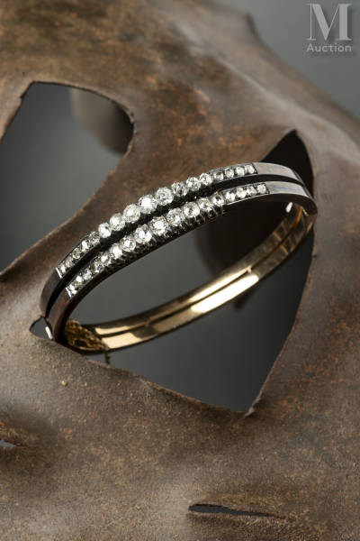 Bracelet en or jaune, or gris 18k (750 millièmes) et argent (800 millièmes) ouvrant et articulé, serti de deux lignes de diamants taille ancienne et en rose. Chaînette de sureté. Travail français vers 1860.