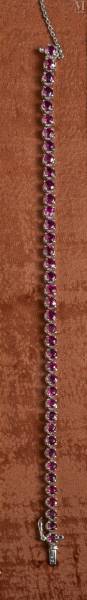 Bracelet souple en argent (800 millièmes) et alliage d'or gris 9k (375 millièmes) serti d'une ligne de rubis ronds.