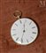 Montre de gousset en or jaune 18k (750 millièmes). Cadran émaillé blanc, index chiffres romains, verre minéral. Mouvement mécanique à remontage manuel par clé. Double boîtier or. Dos du boîtier ciselé de lambrequins et d'un cartouche sur fond guilloché.