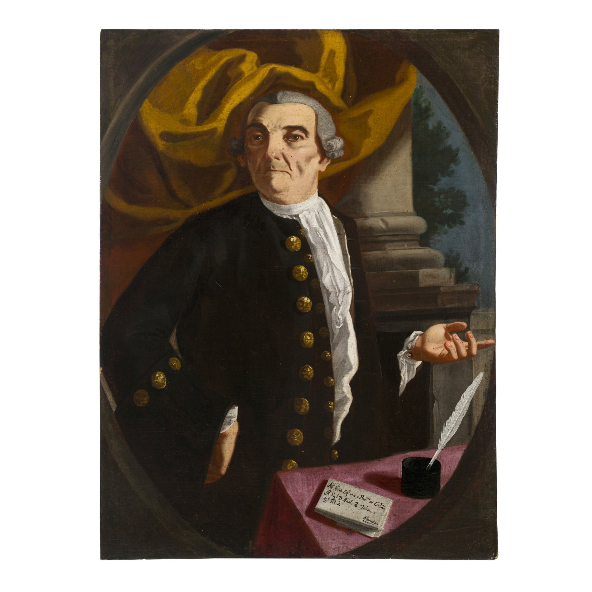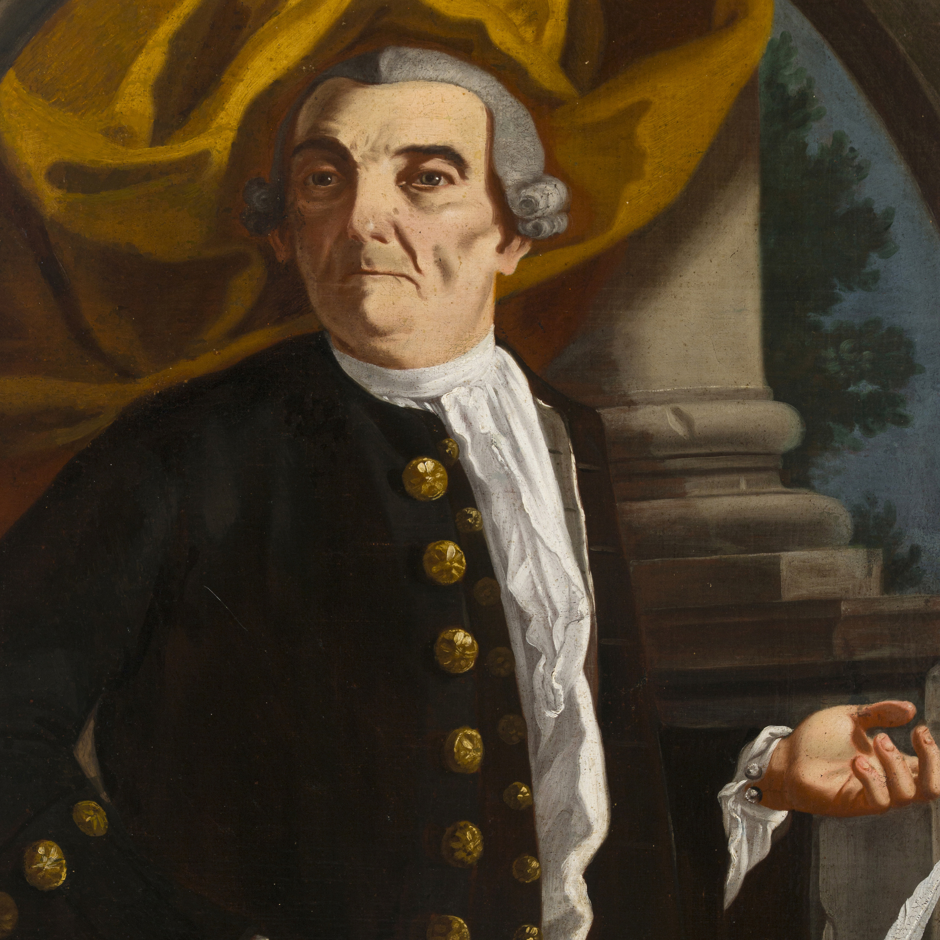The painting finds a convincing comparison in the Portrait of Robert Jones, a three-quarter-length figure standing beside a gilded Baroque table with a classical landscape in the background, presented at Sotheby’s in December 2023.