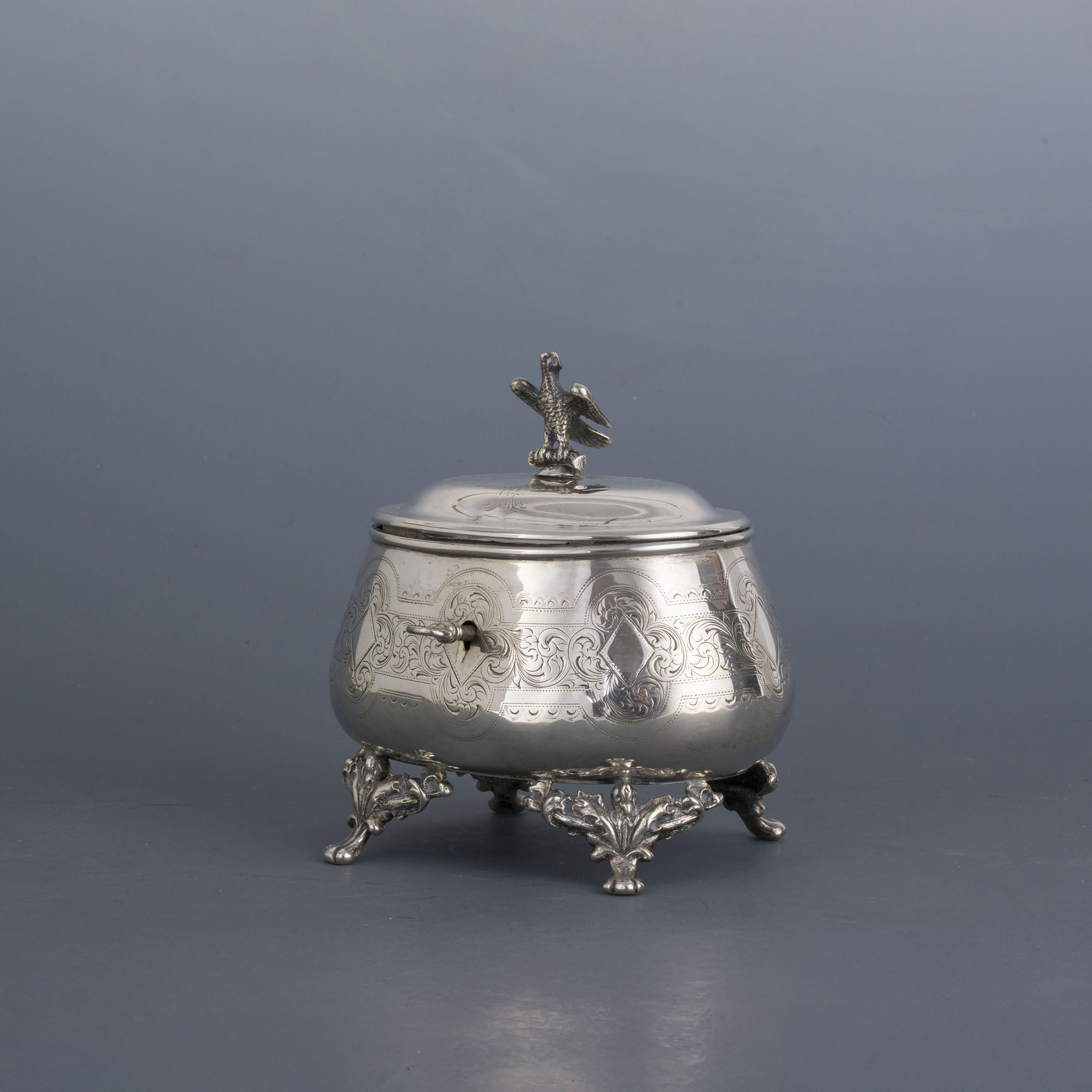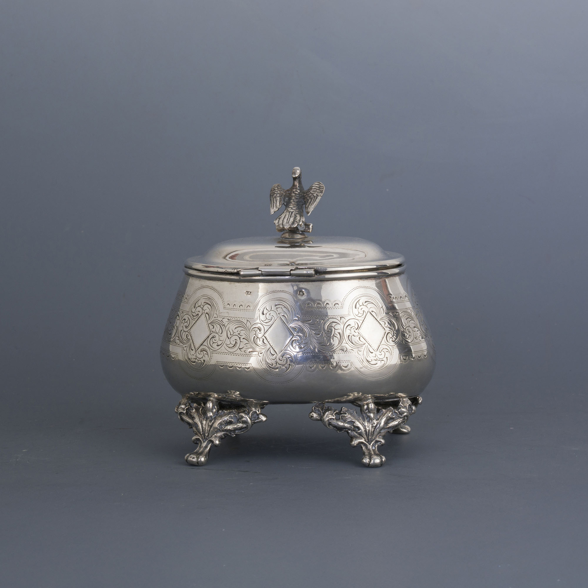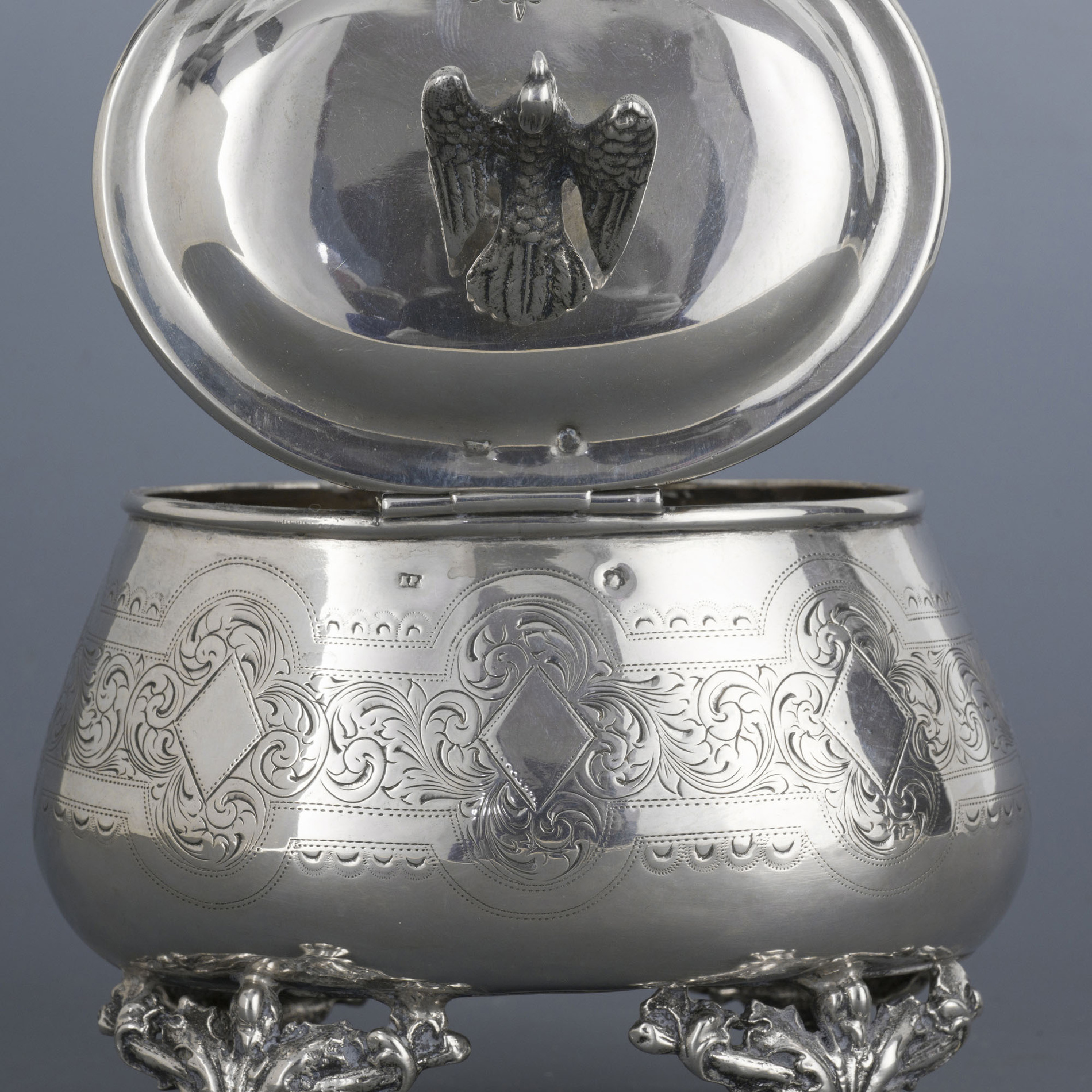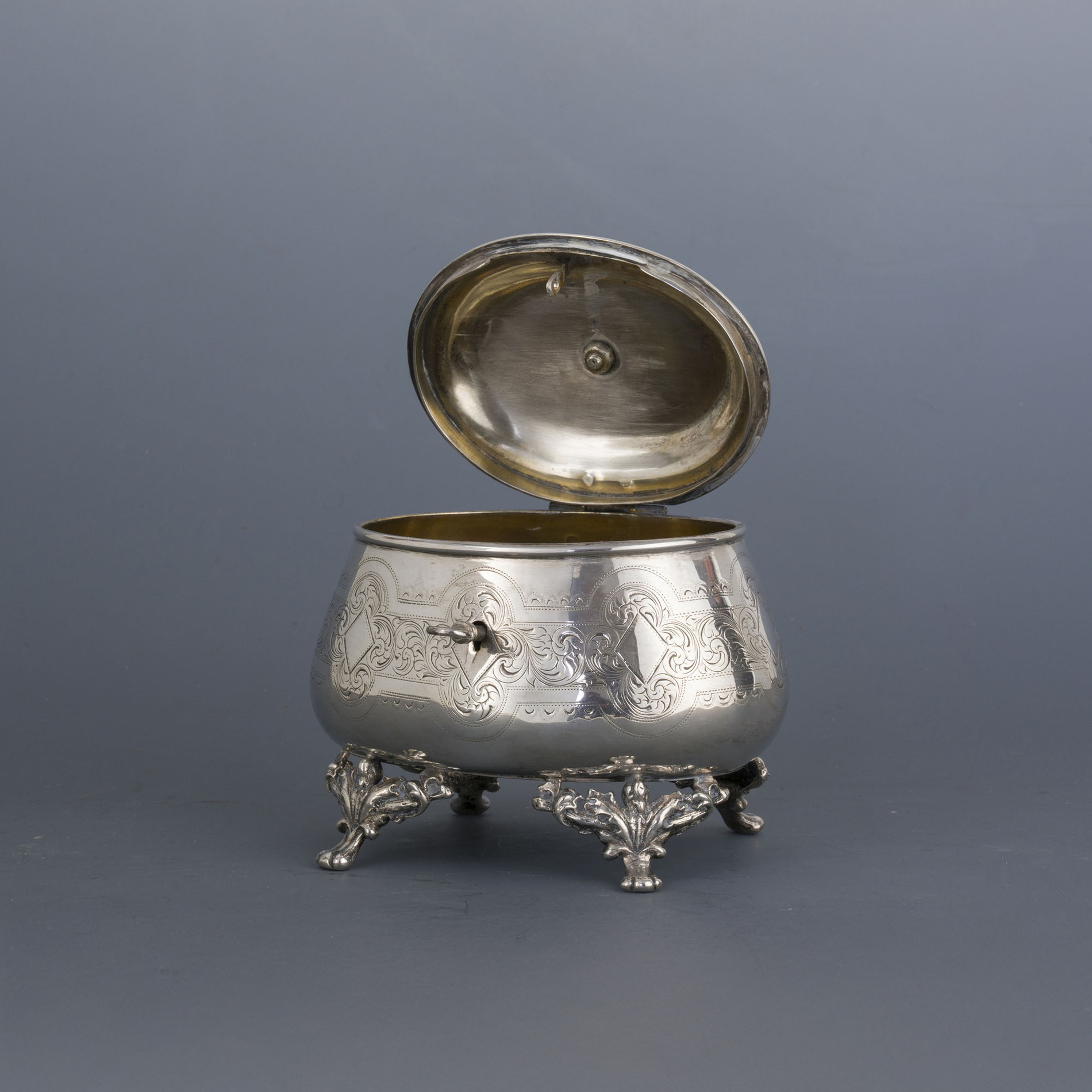 Forma ovale liscia con decori incisi, coperchio incernierato con cimasa a foggia di aquila, montanti a zampa ferina