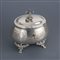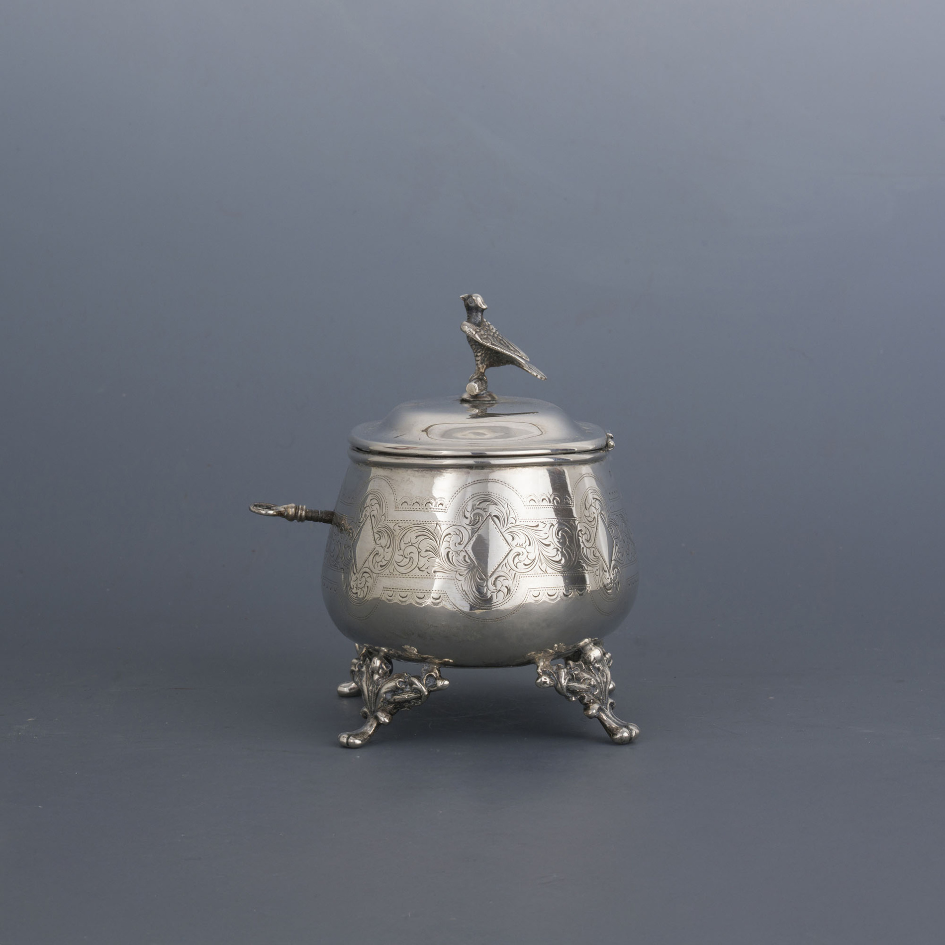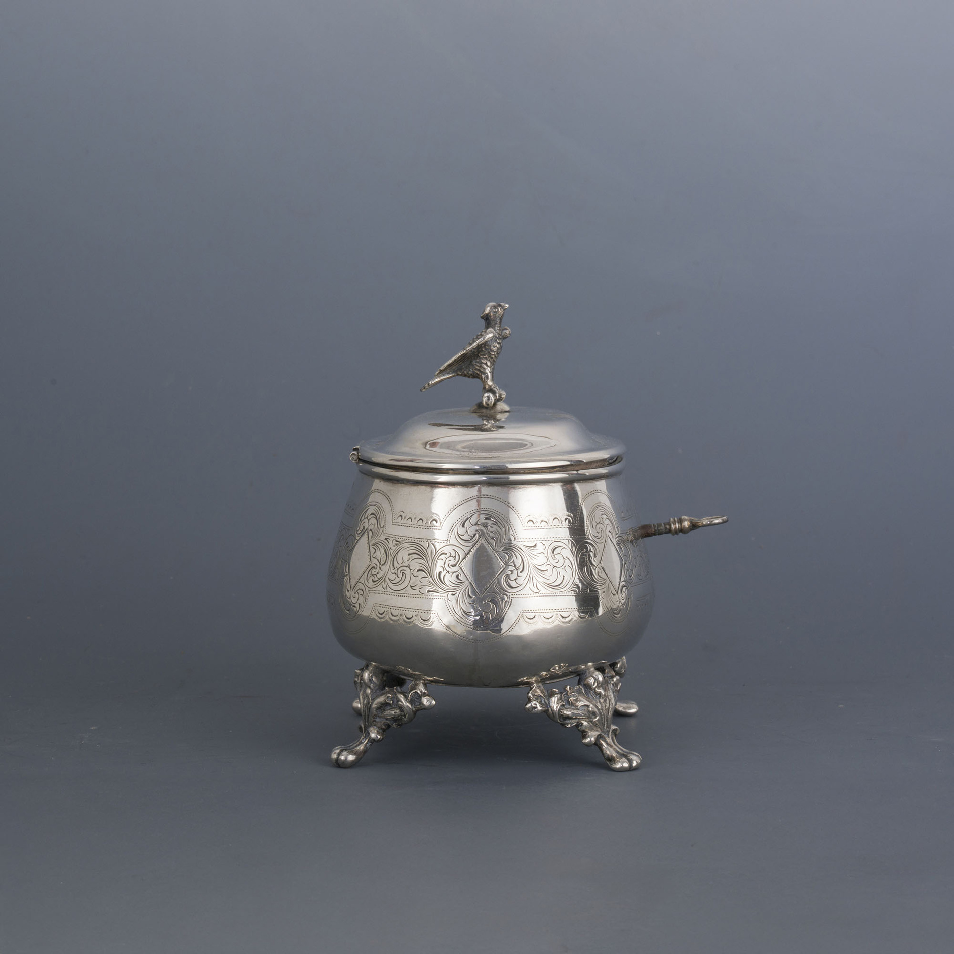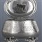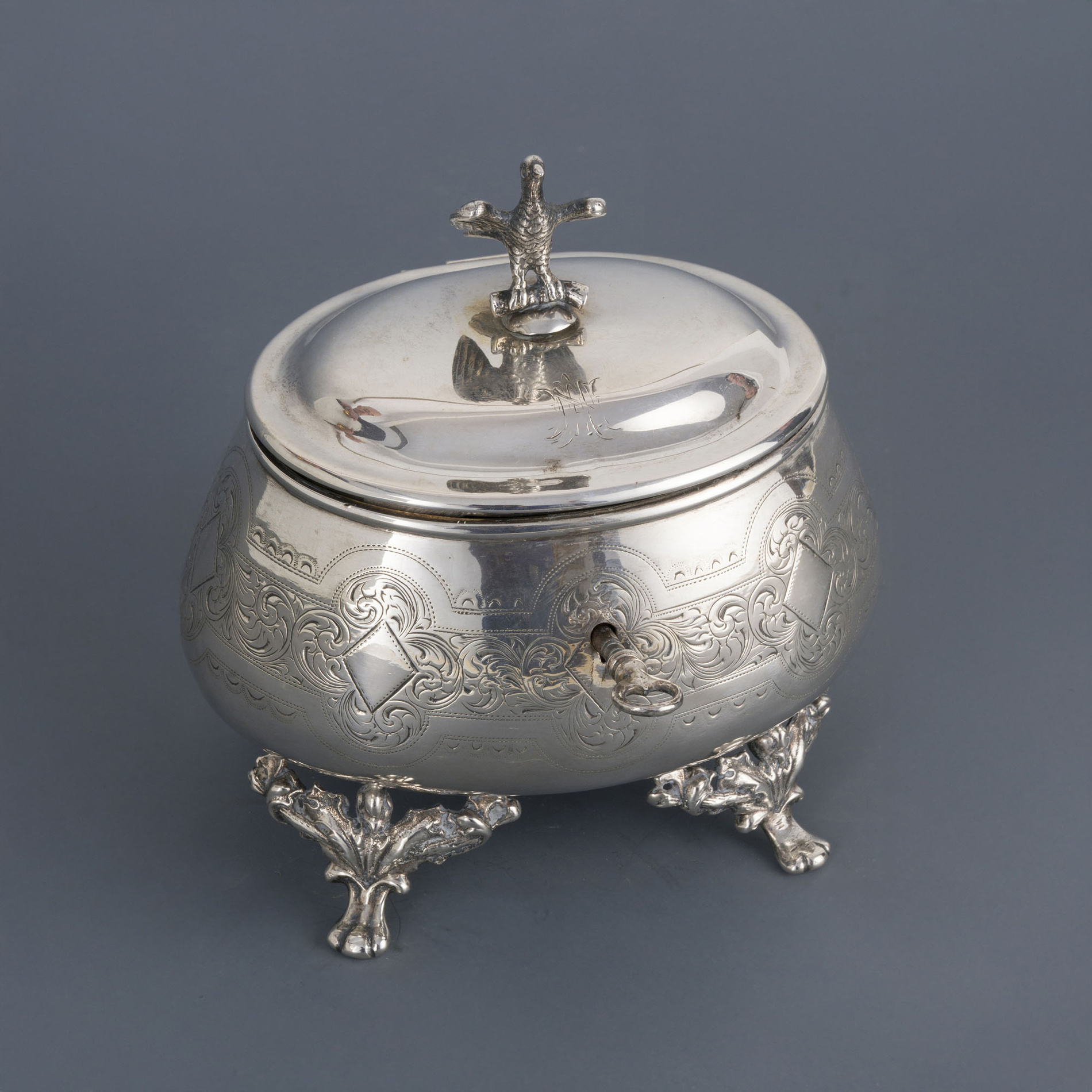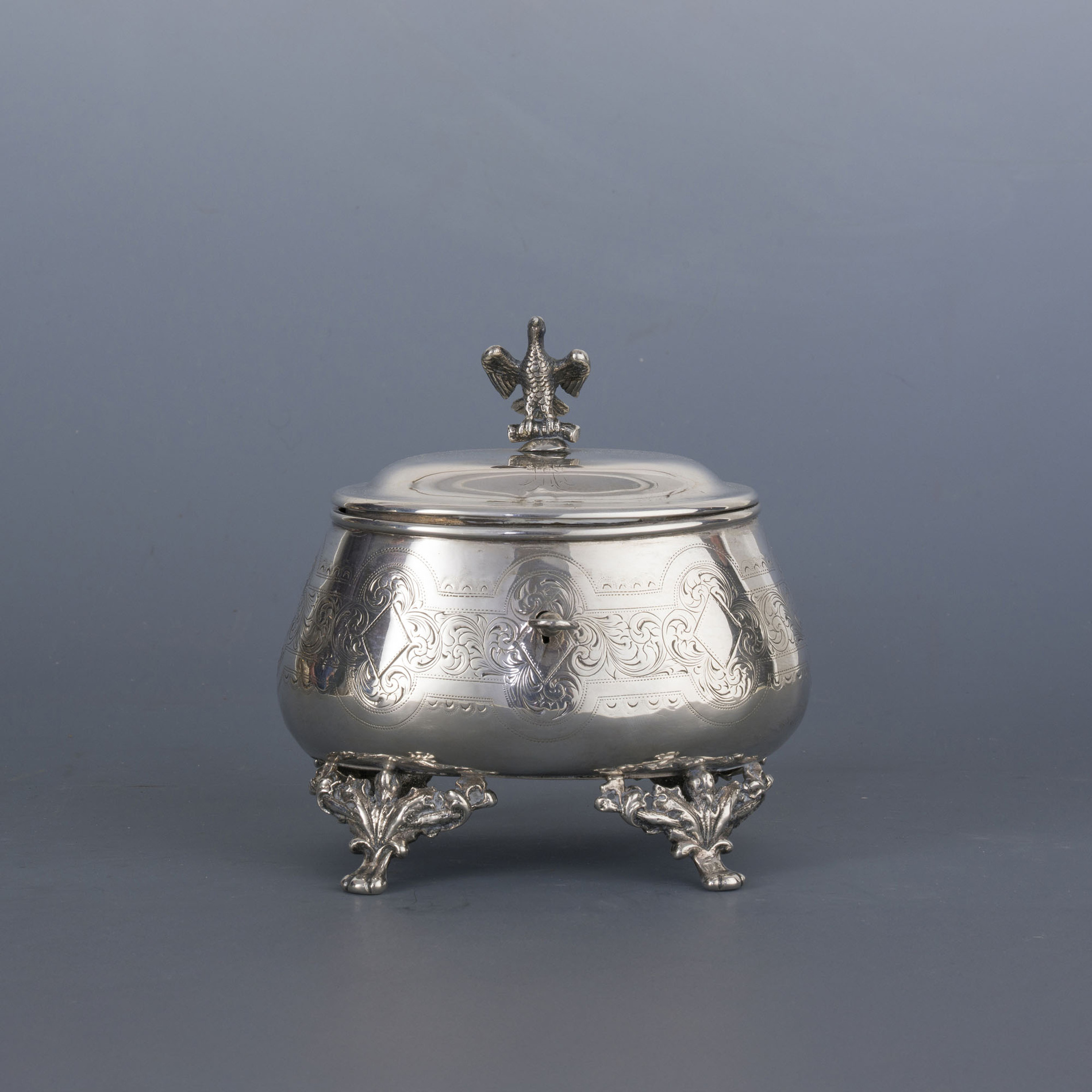 Forma ovale liscia con decori incisi, coperchio incernierato con cimasa a foggia di aquila, montanti a zampa ferina