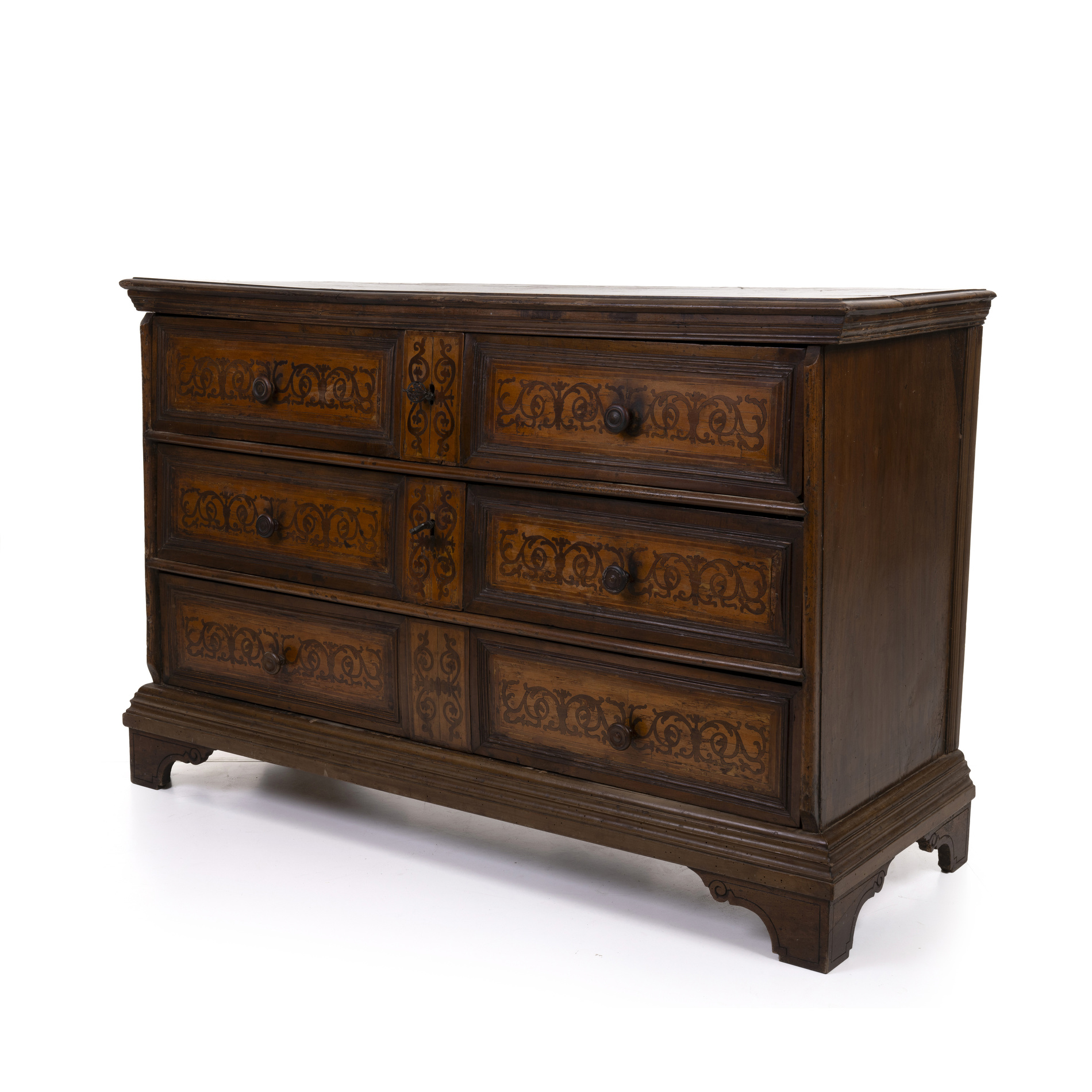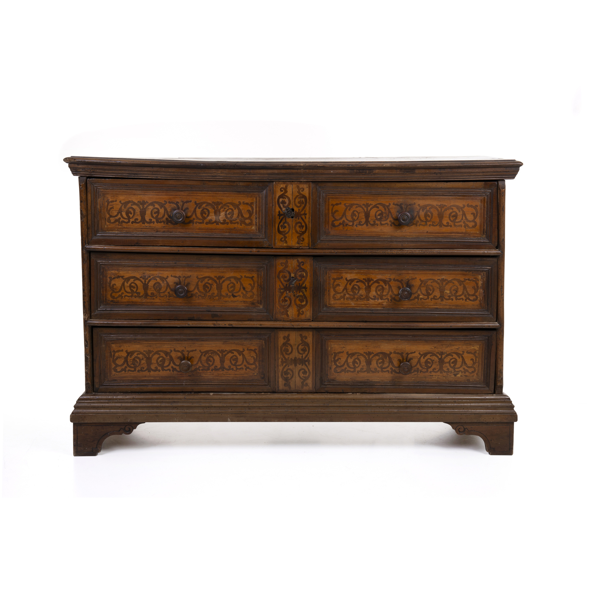 Fronte a tre cassetti con delicato decoro ad intarsio.