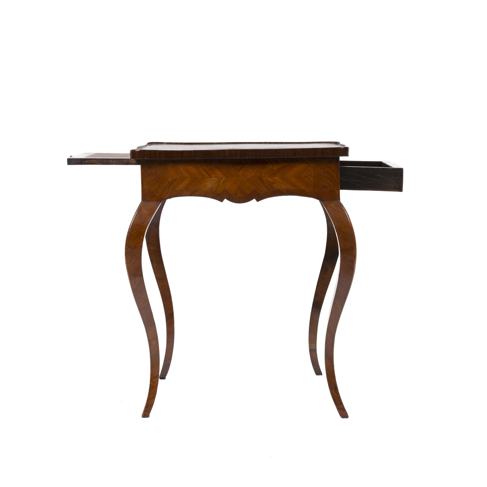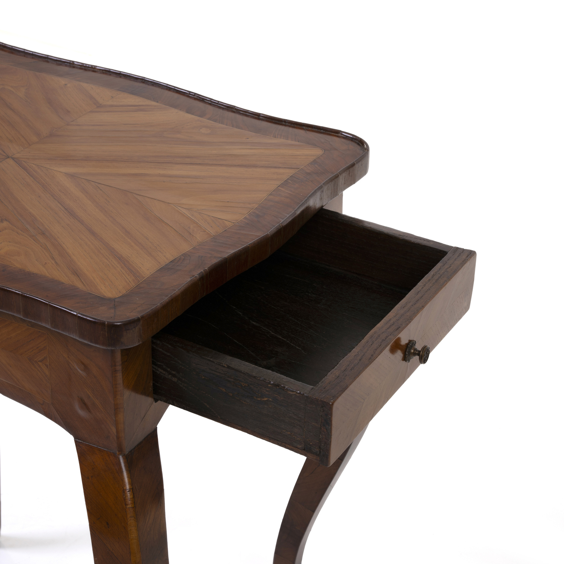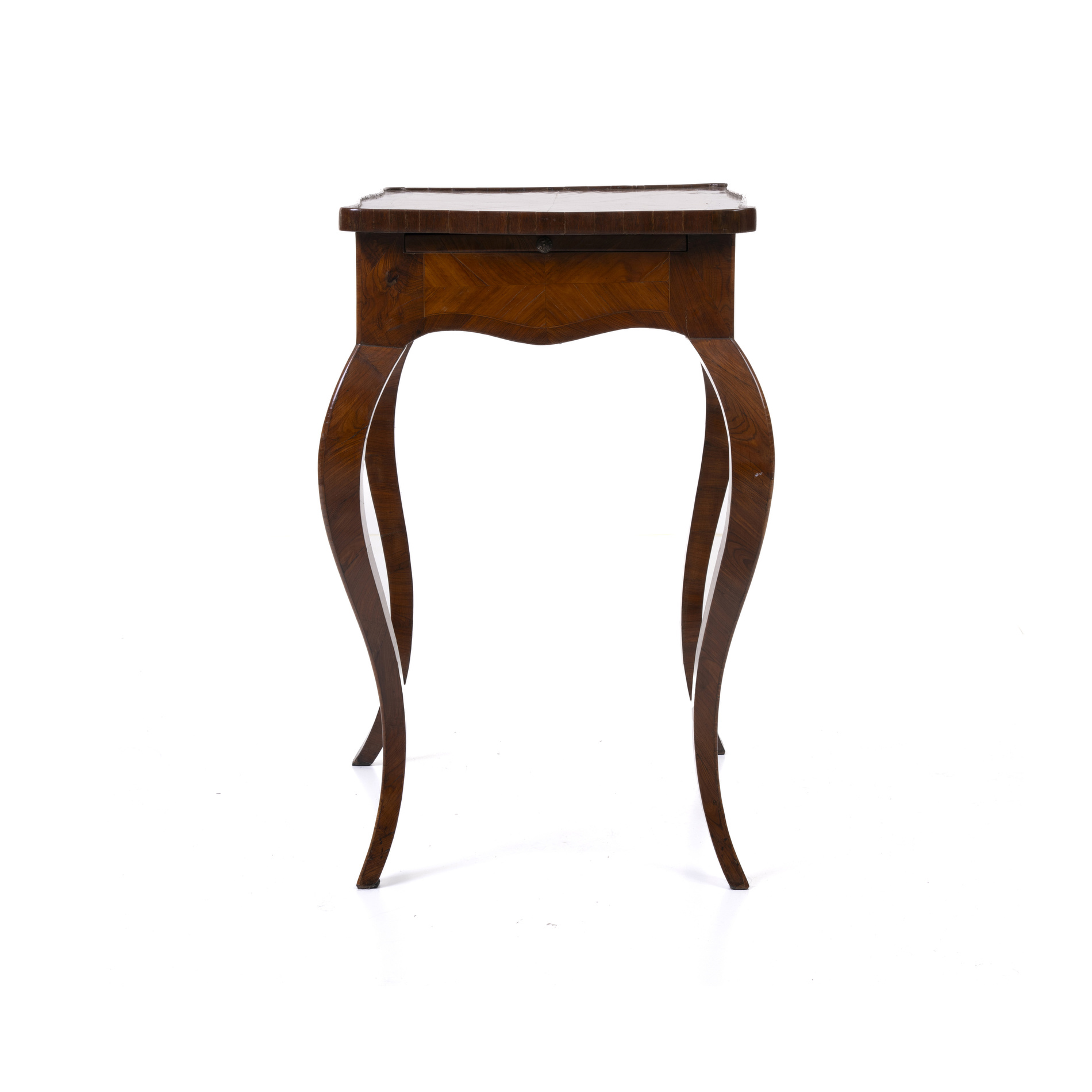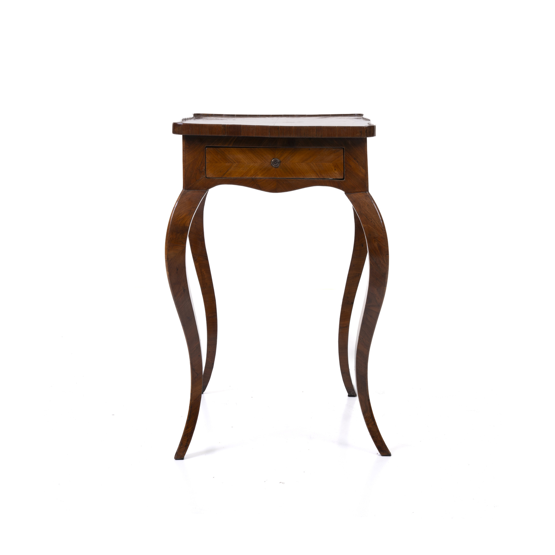 Tray top with shaped edge, one drawer at the front, and curved legs.