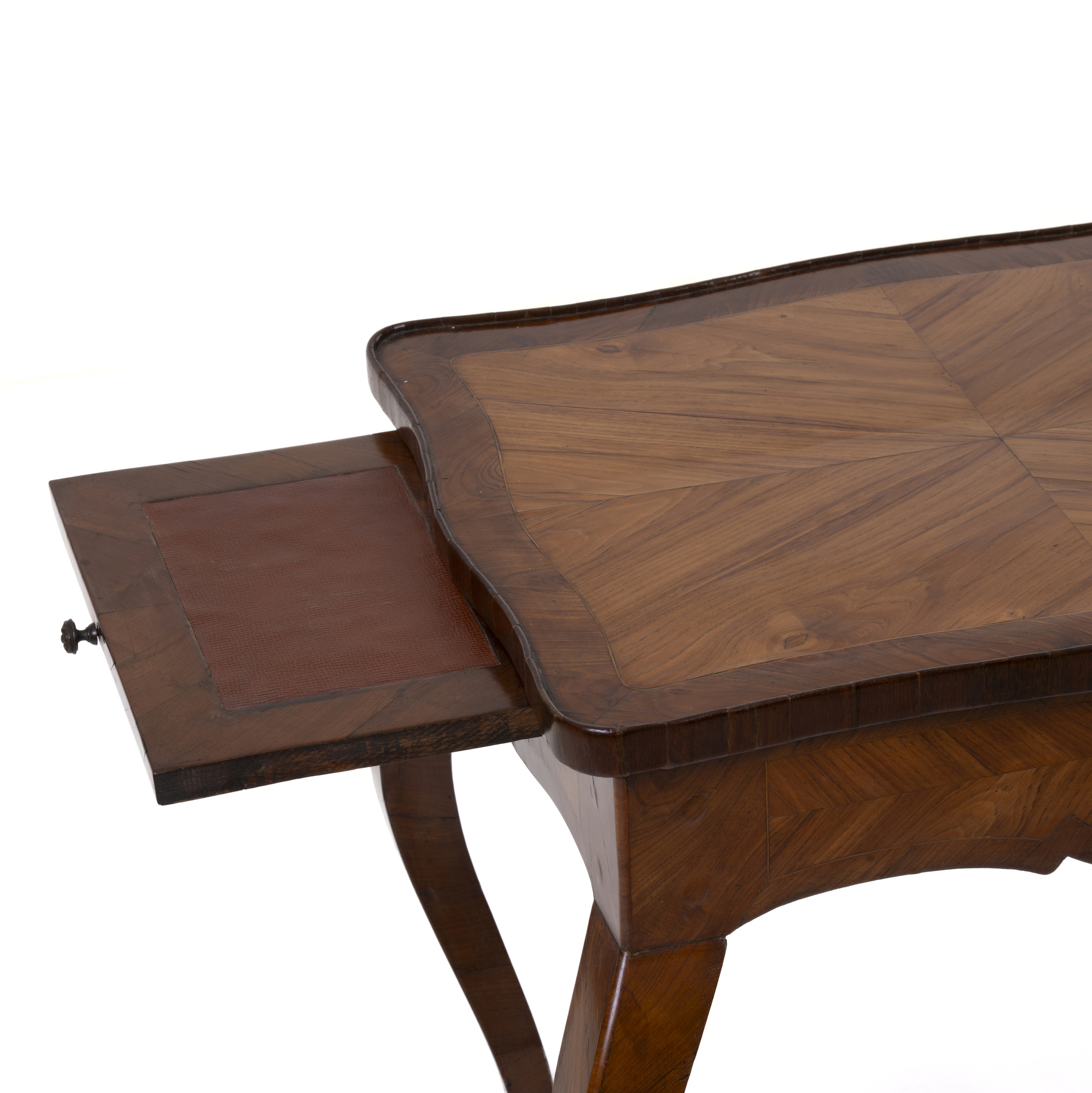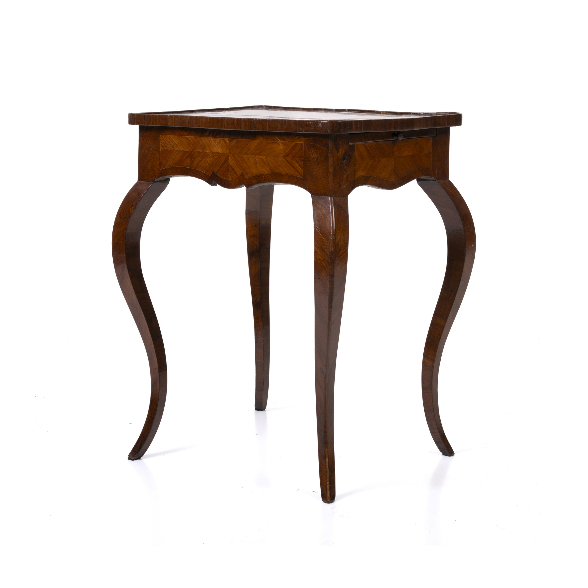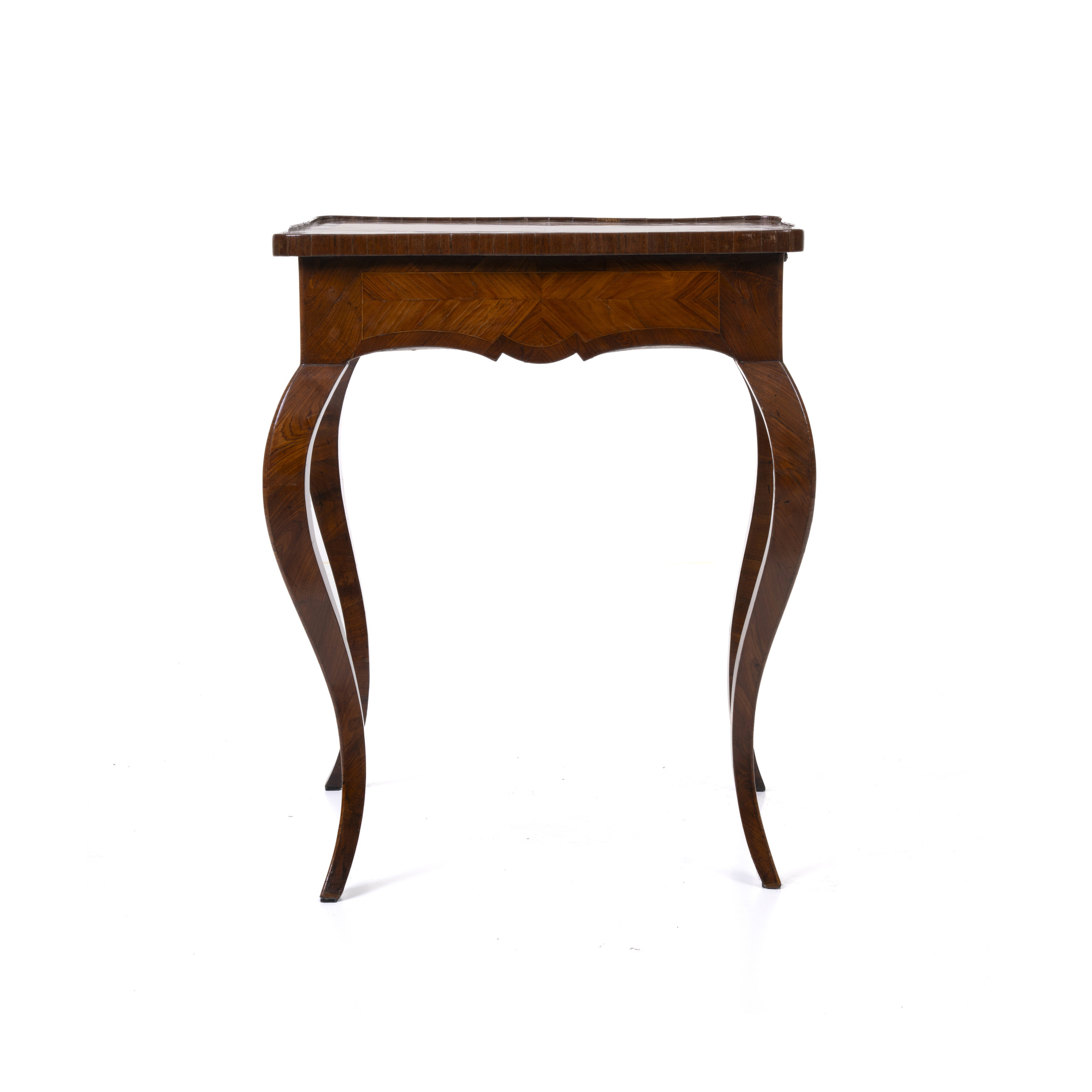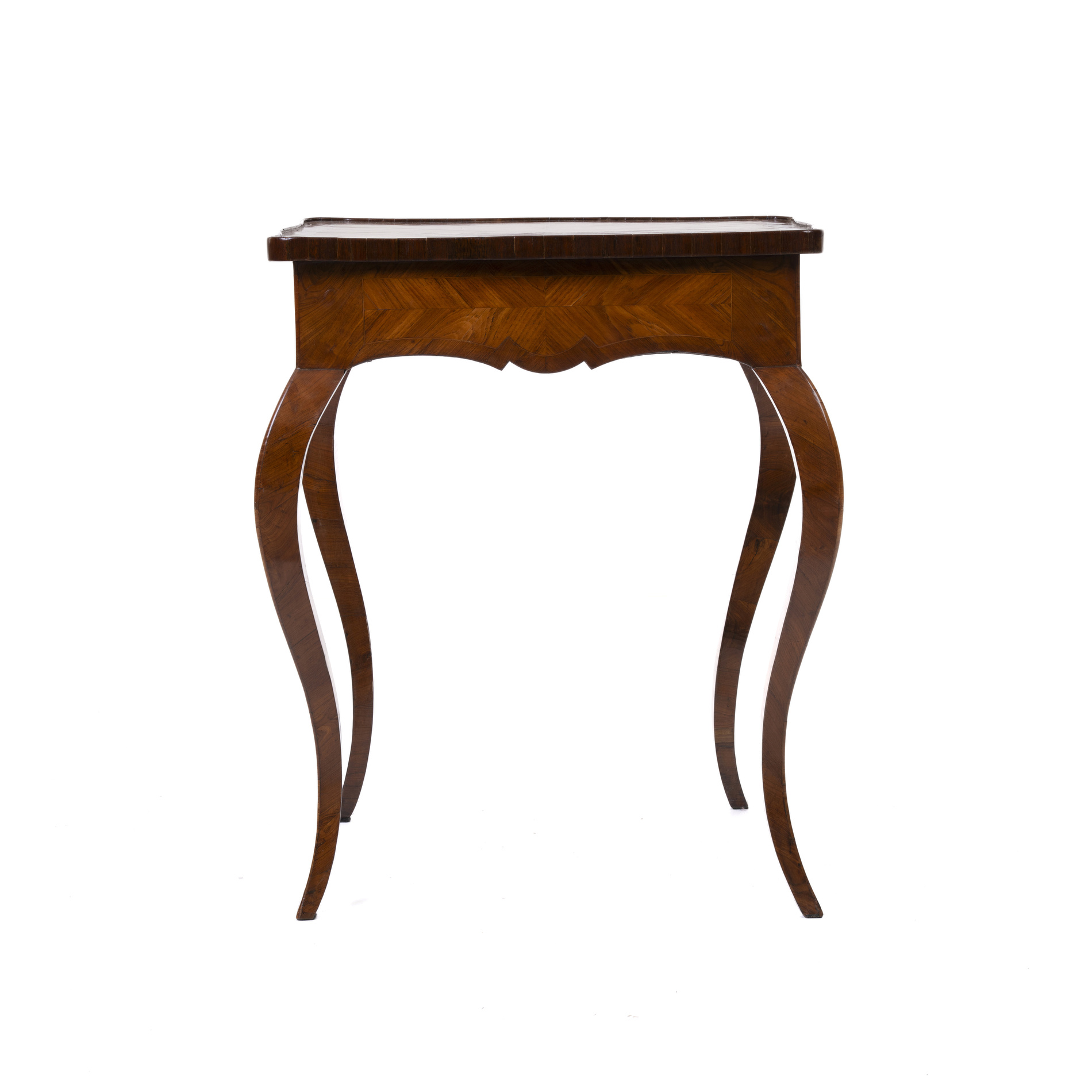 Tray top with shaped edge, one drawer at the front, and curved legs.
