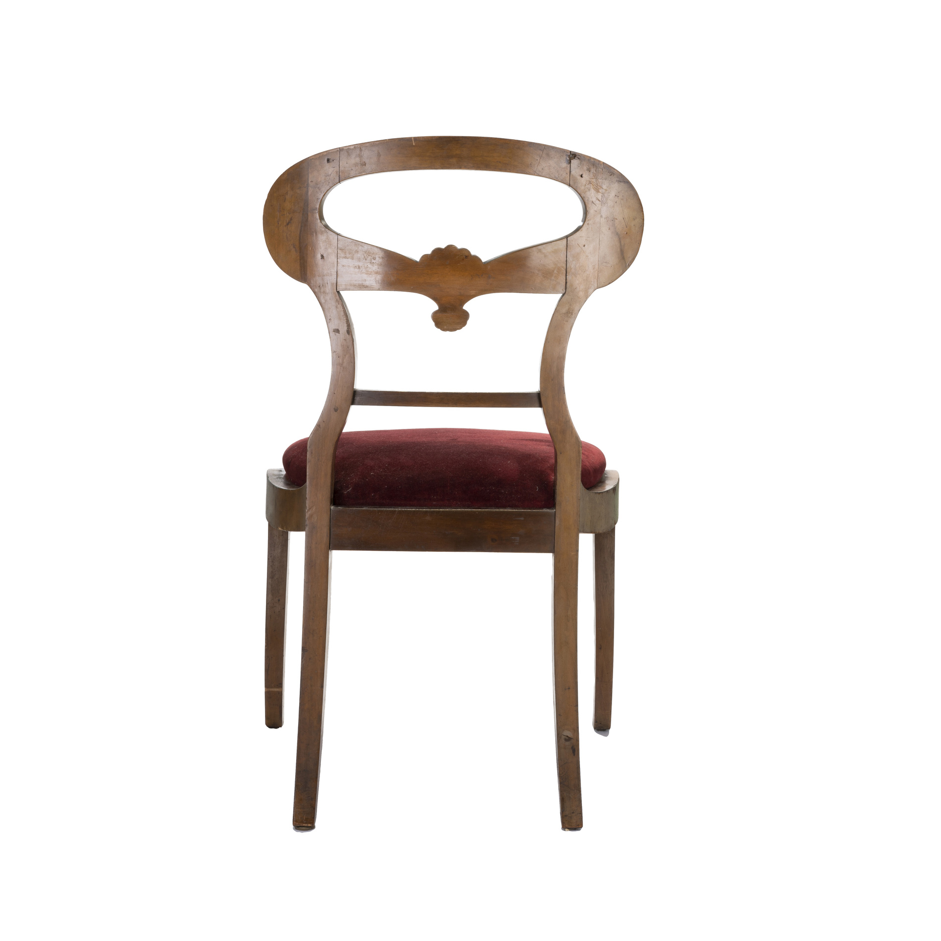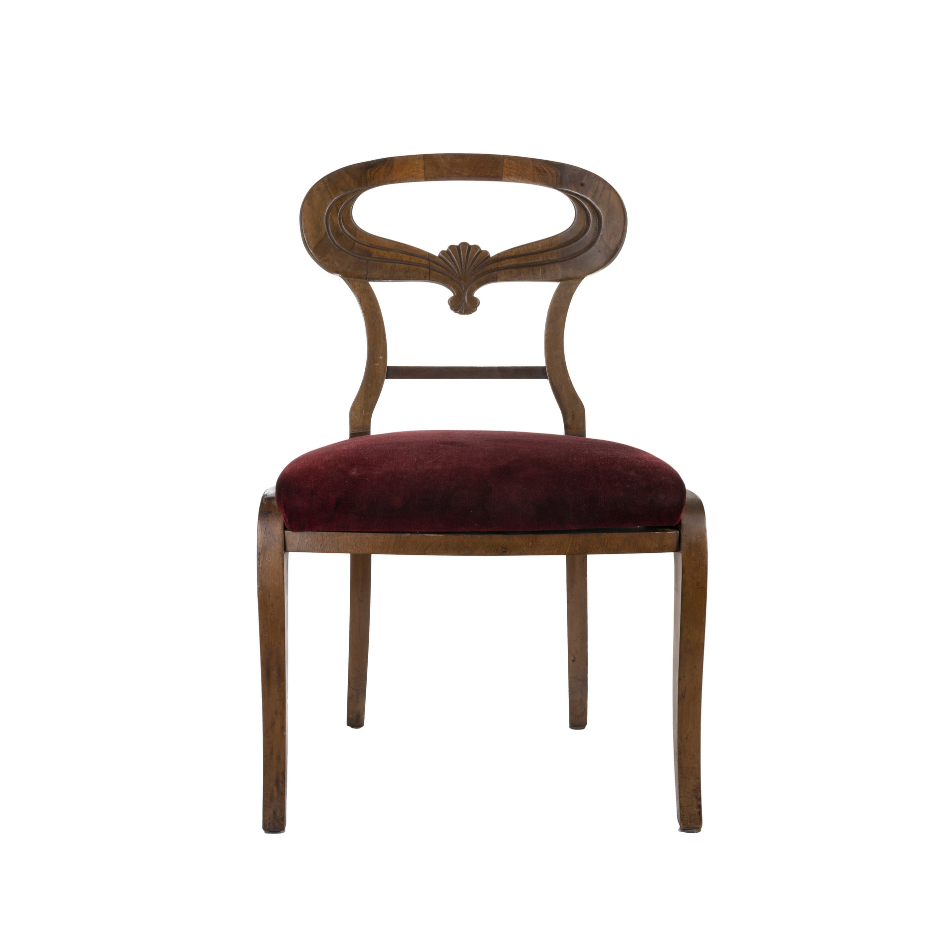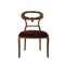 In stile Biedermeier con schienale a giorno sagomato, seduta imbottita e gambe a sciabola.