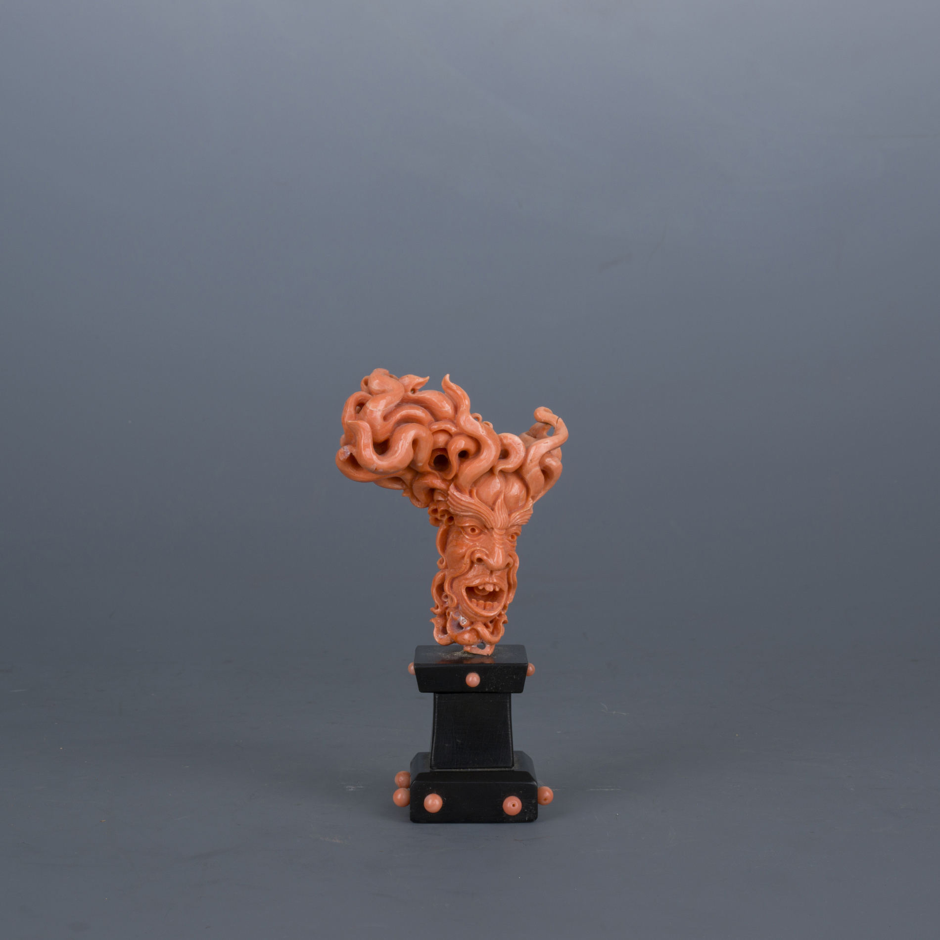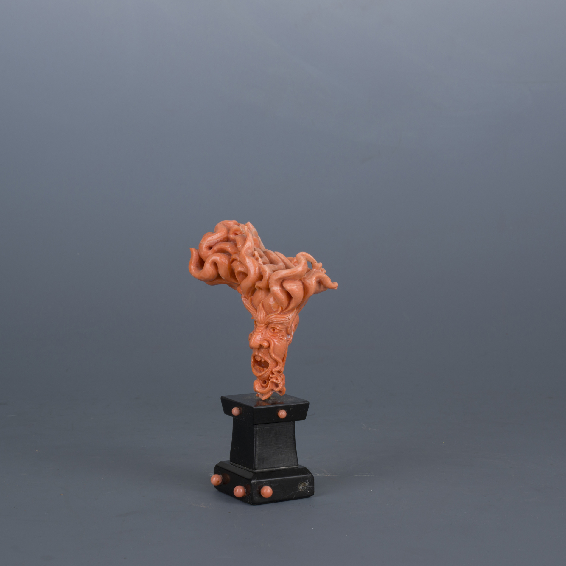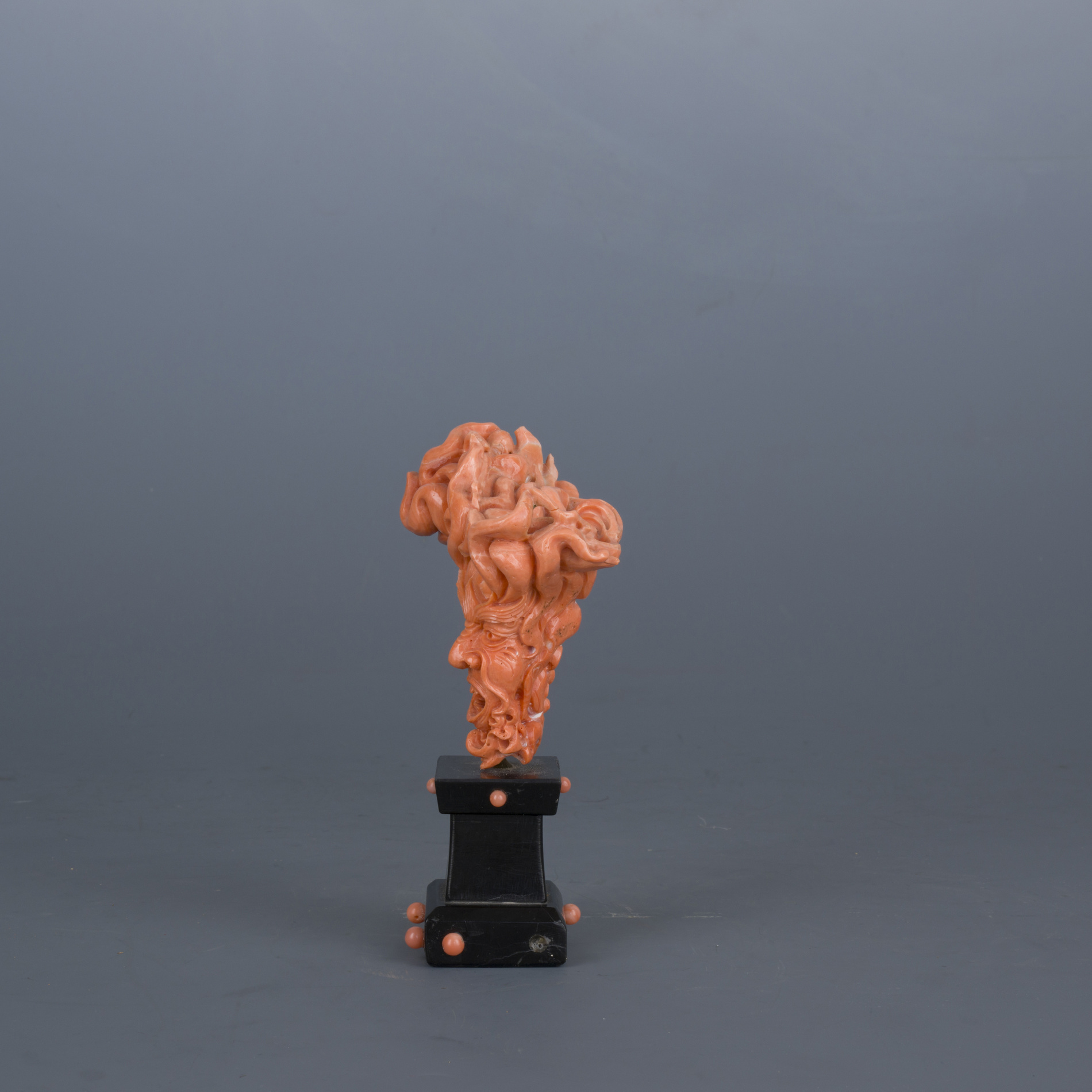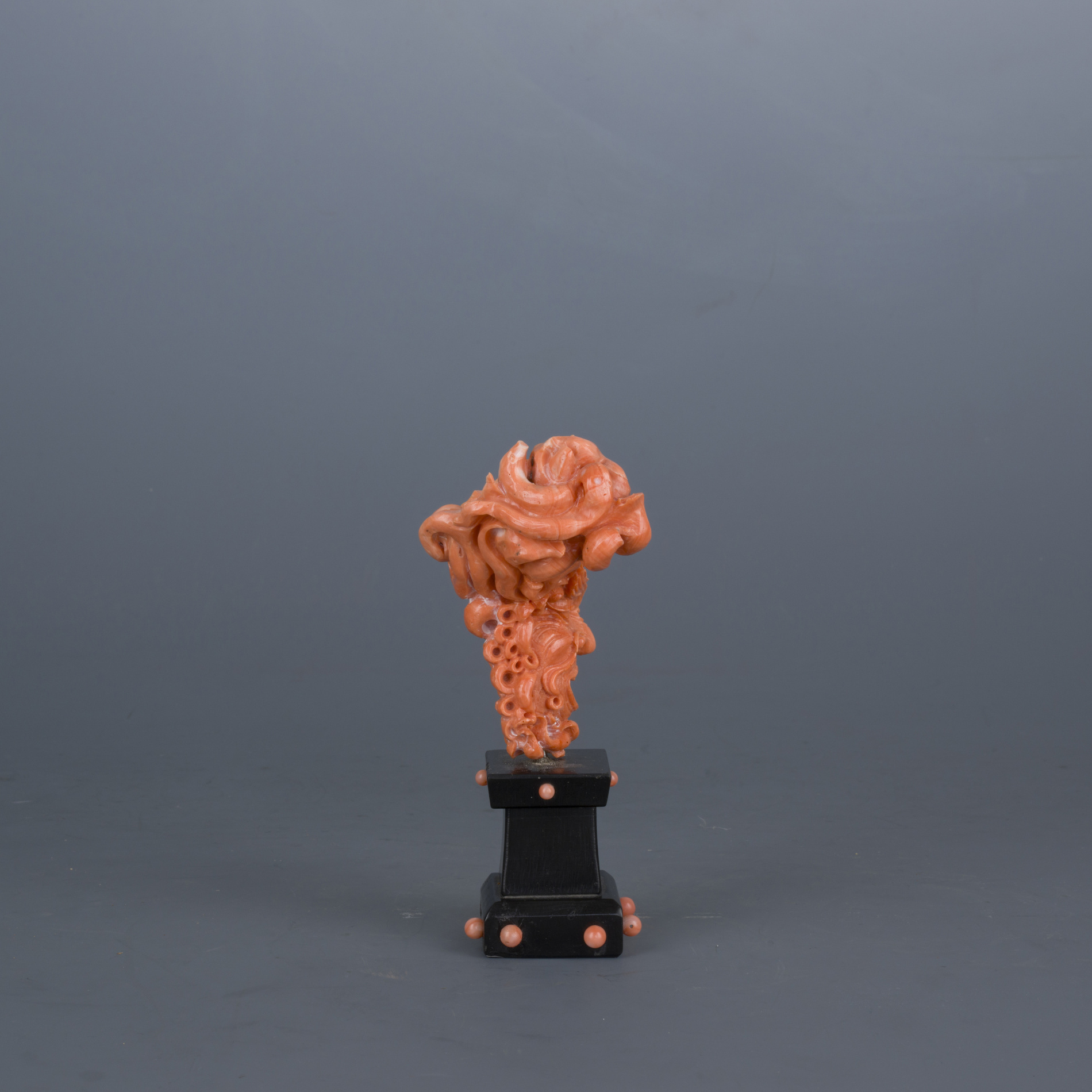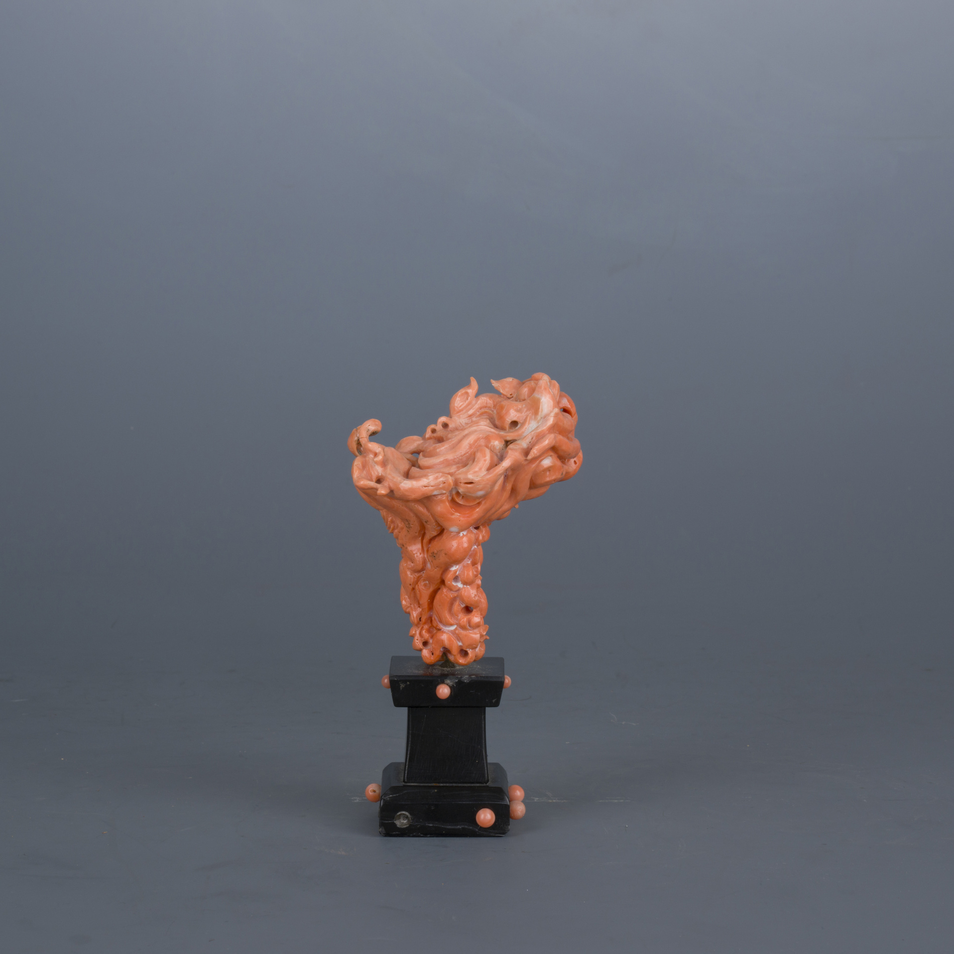 Corallo finemente lavorato, poggiante su base in legno con applicazioni di sfere in corallo