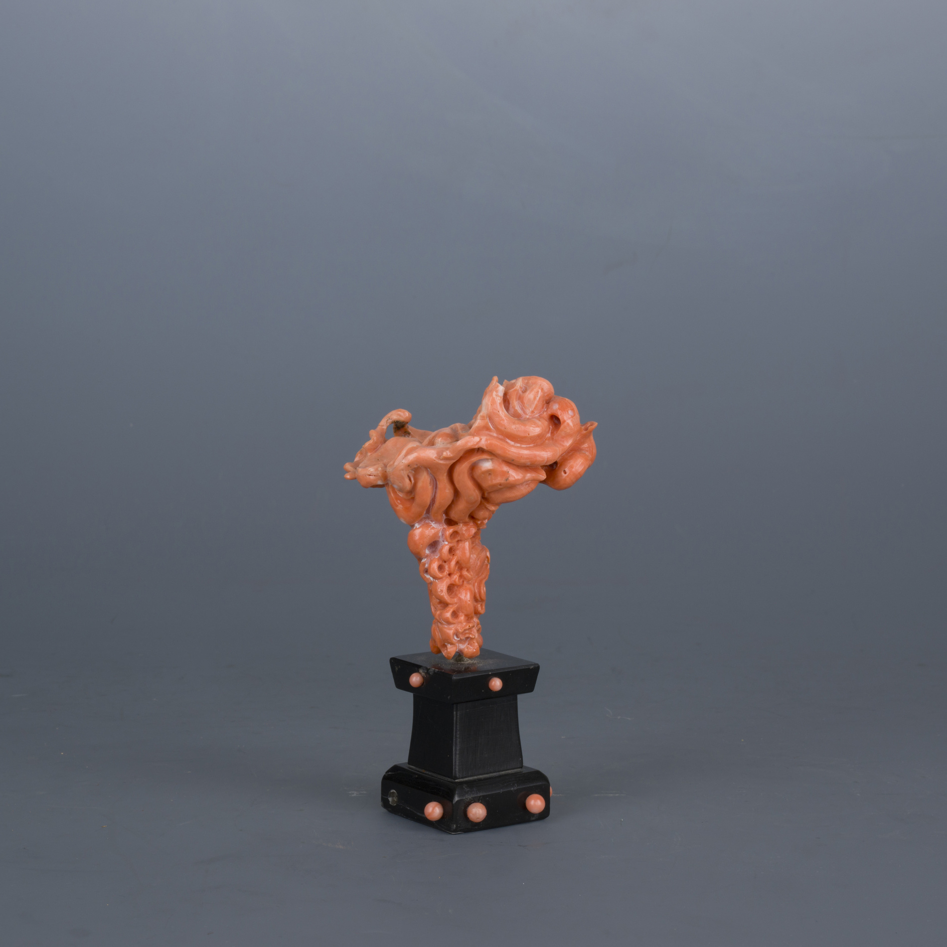 Finely worked coral, resting on a wooden base with coral ball appliqués