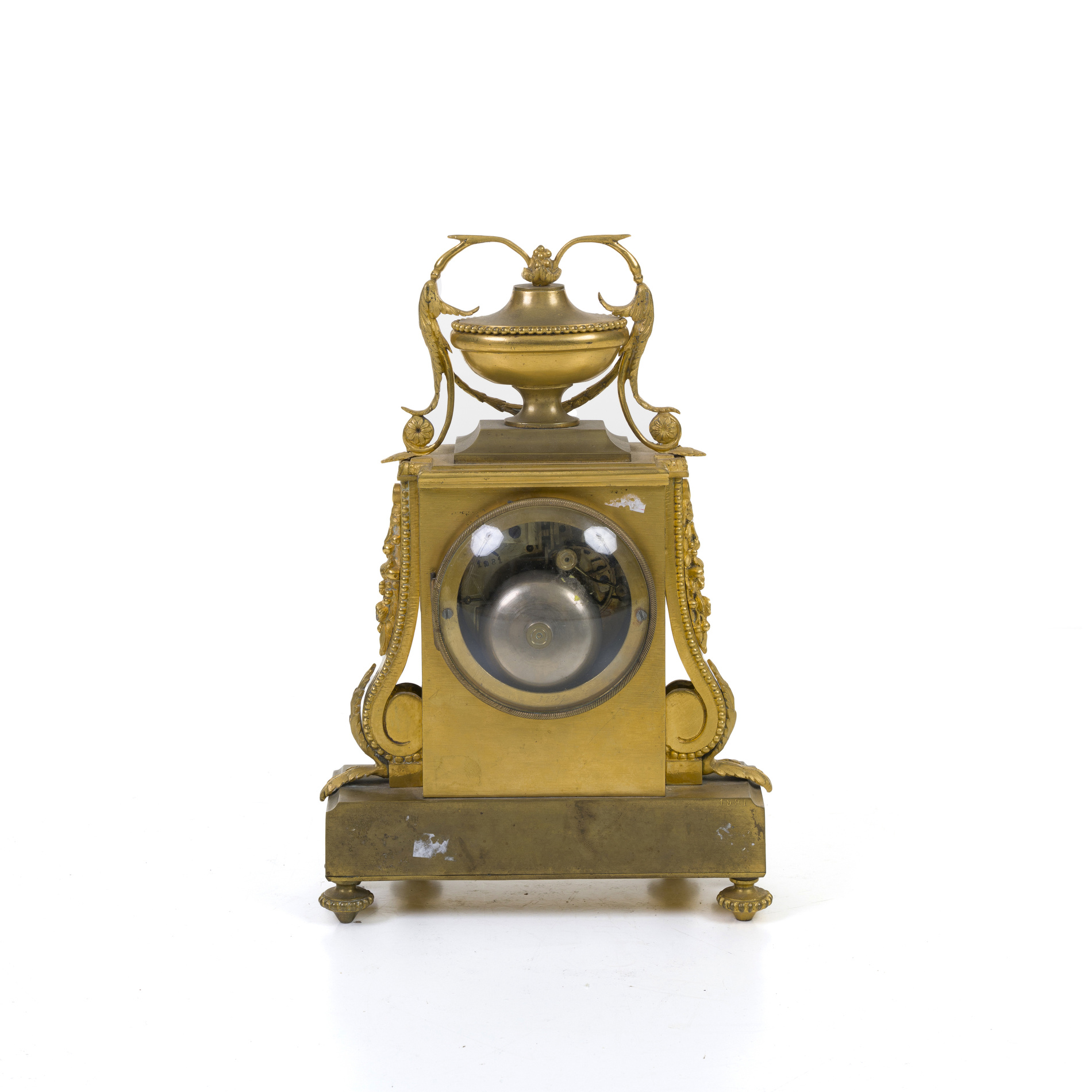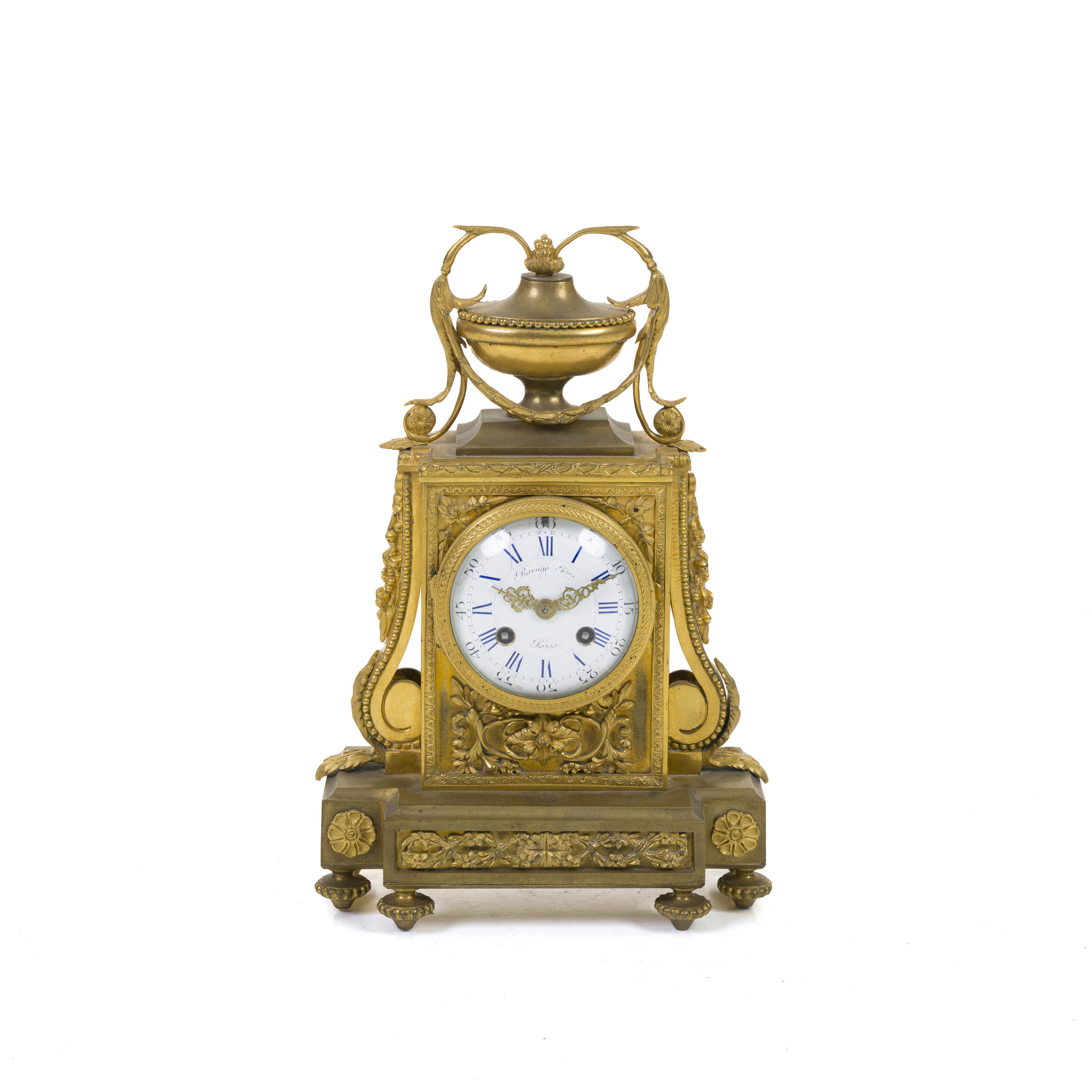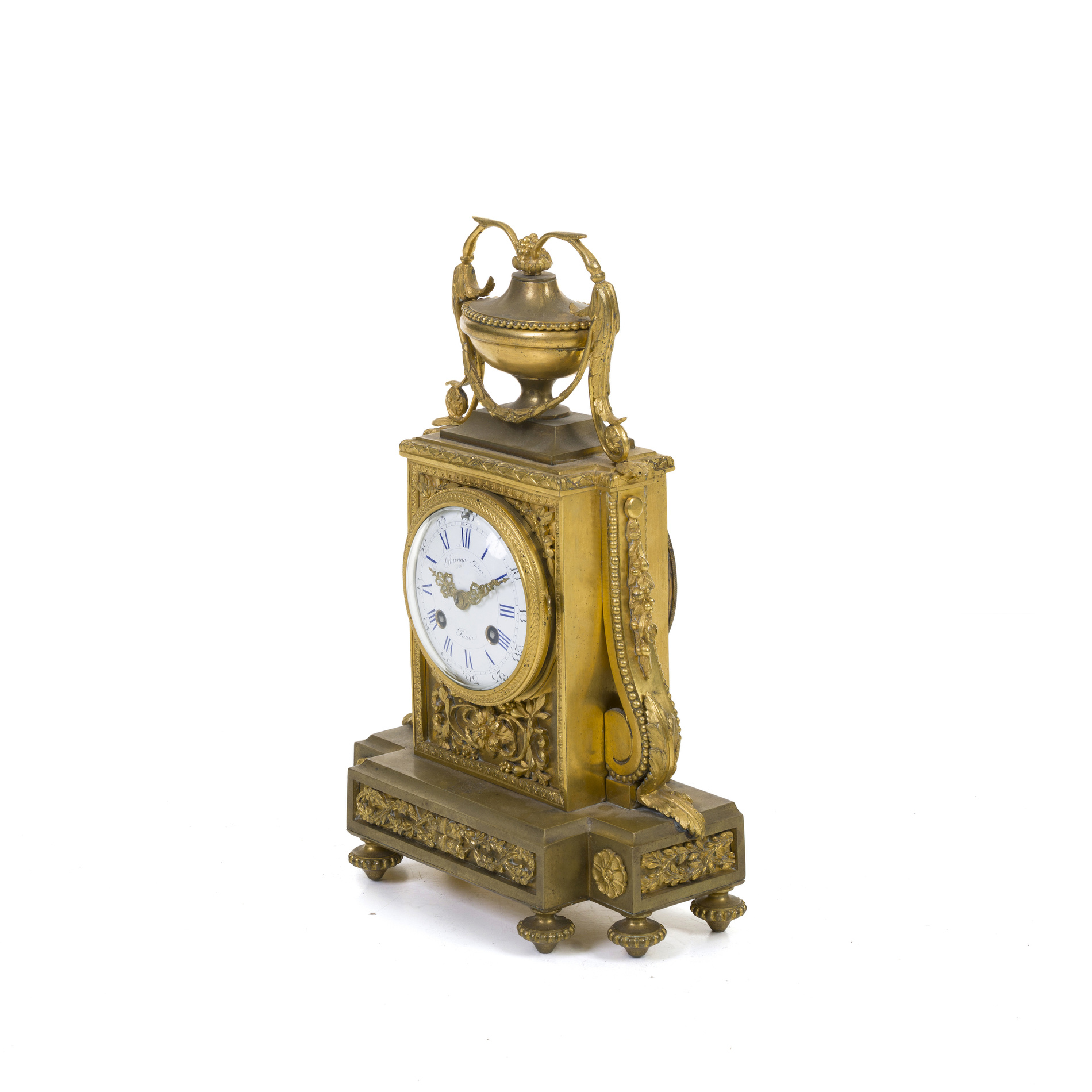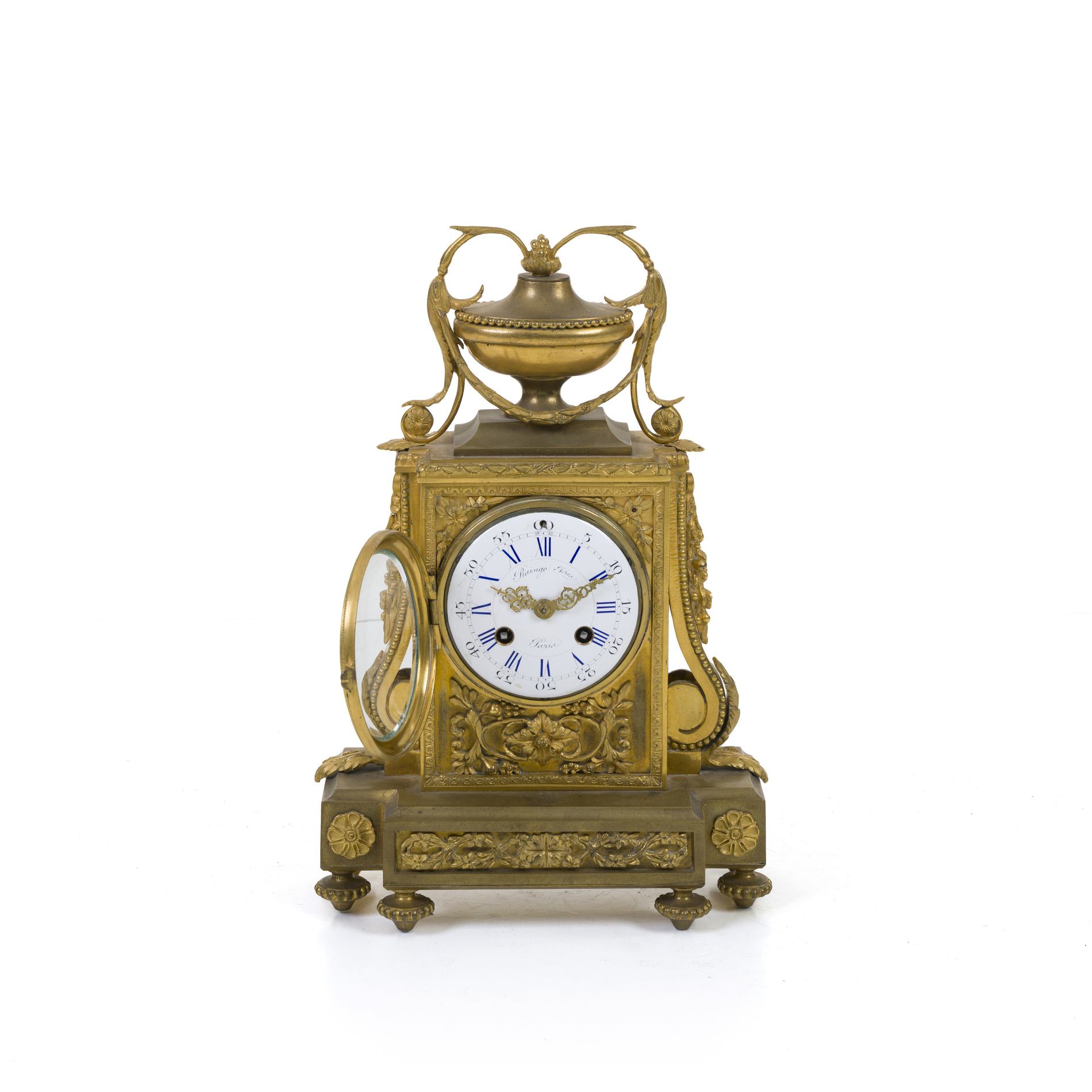 Finely chased case surmounted by a vase surrounded by garlands.