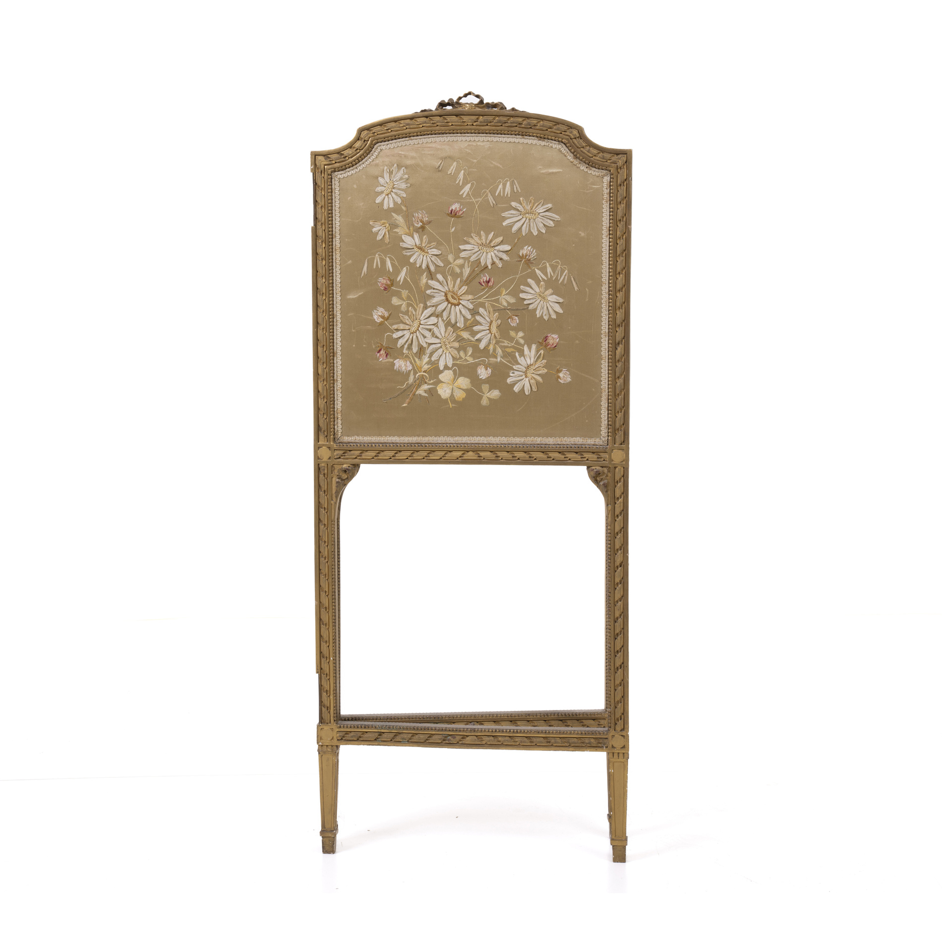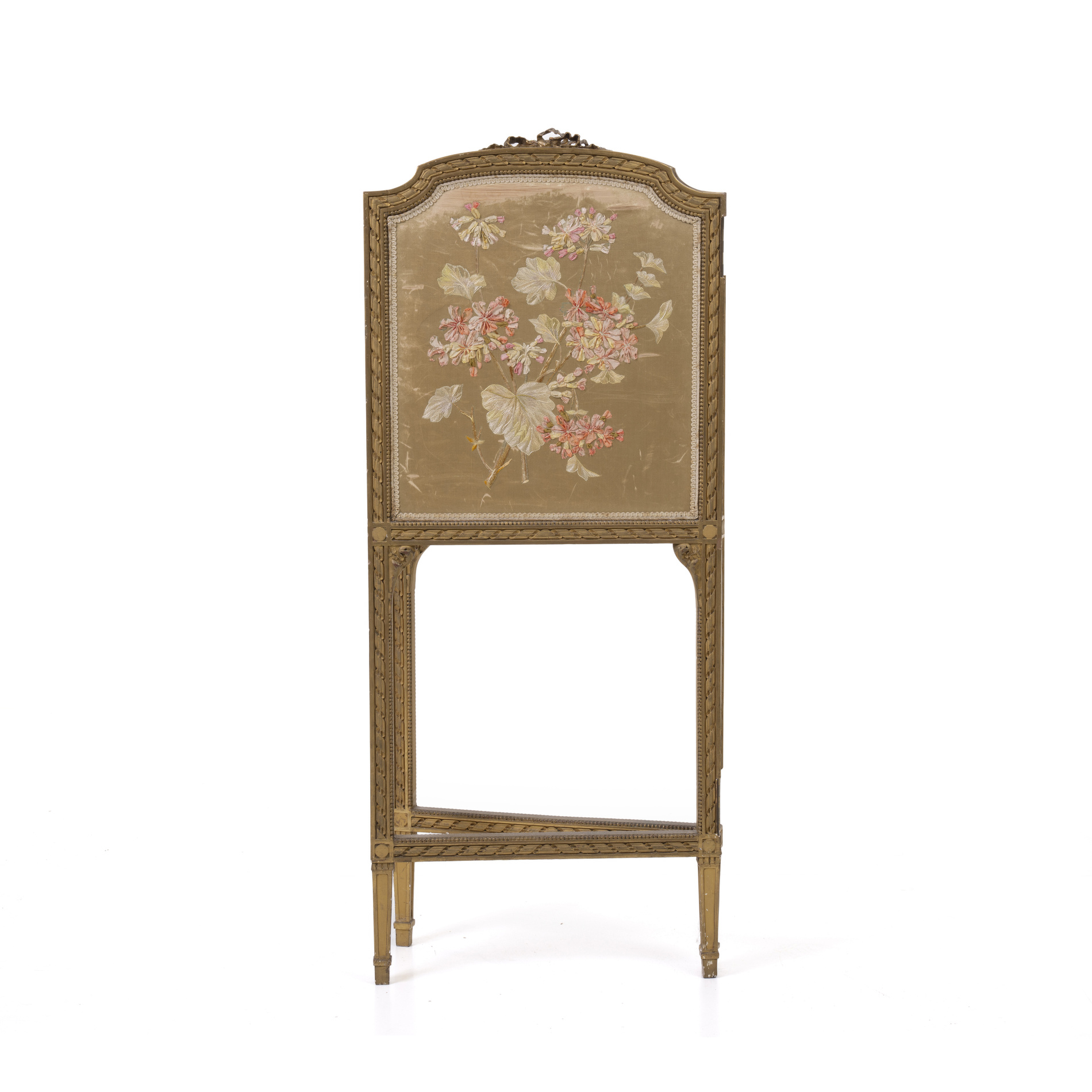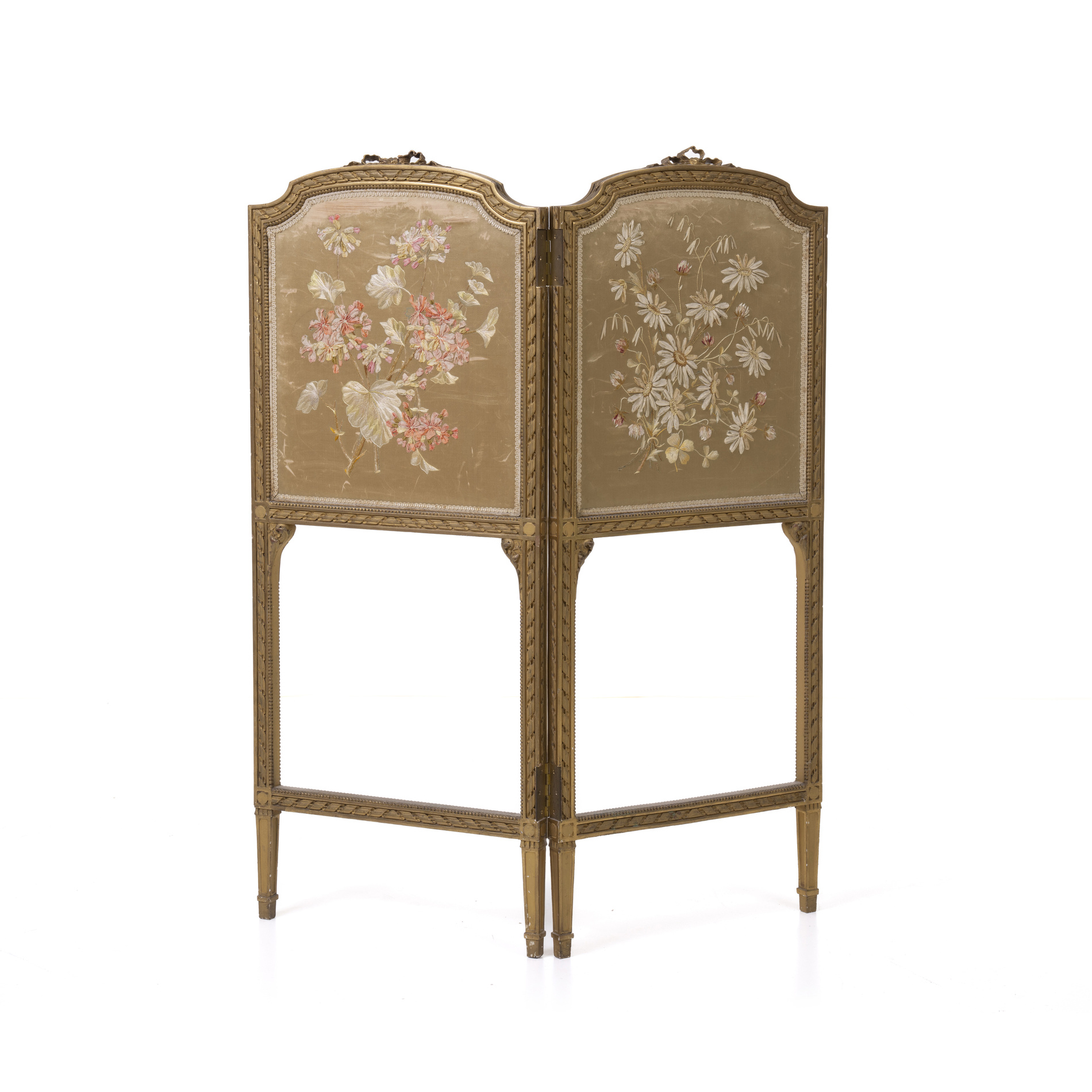 Carved and gilded wood, floral embroidered fabric panels