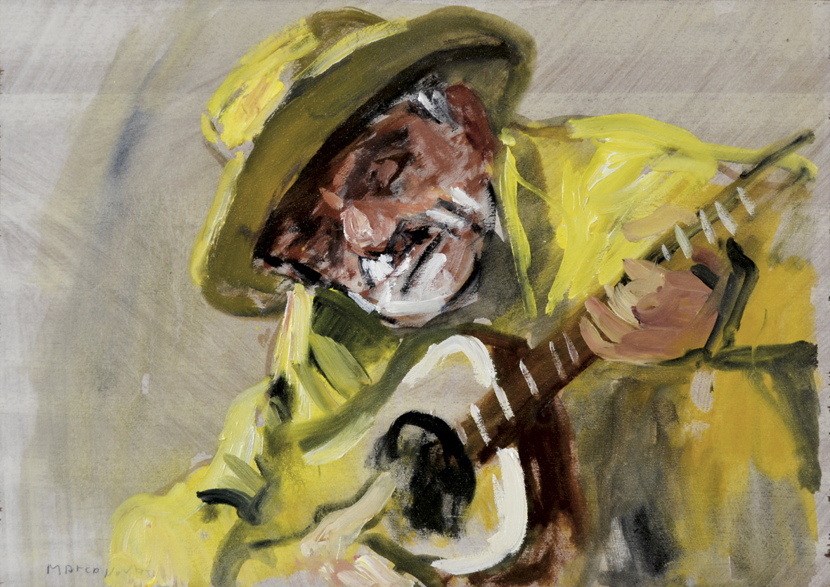 NOVATI MARCO Venezia 1895 - 1975 Suonatore olio su tavola 21x30 firma in basso a sinistra firma e titolo al retro