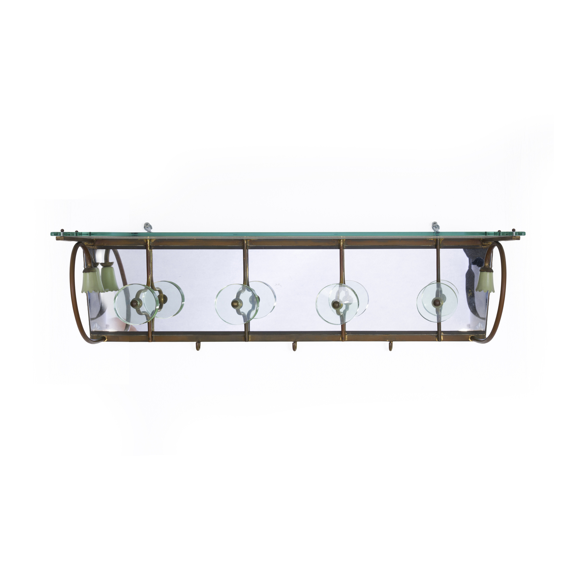 Brass and patinated metal structure, shelf and details in transparent cut glass and mirrored glass