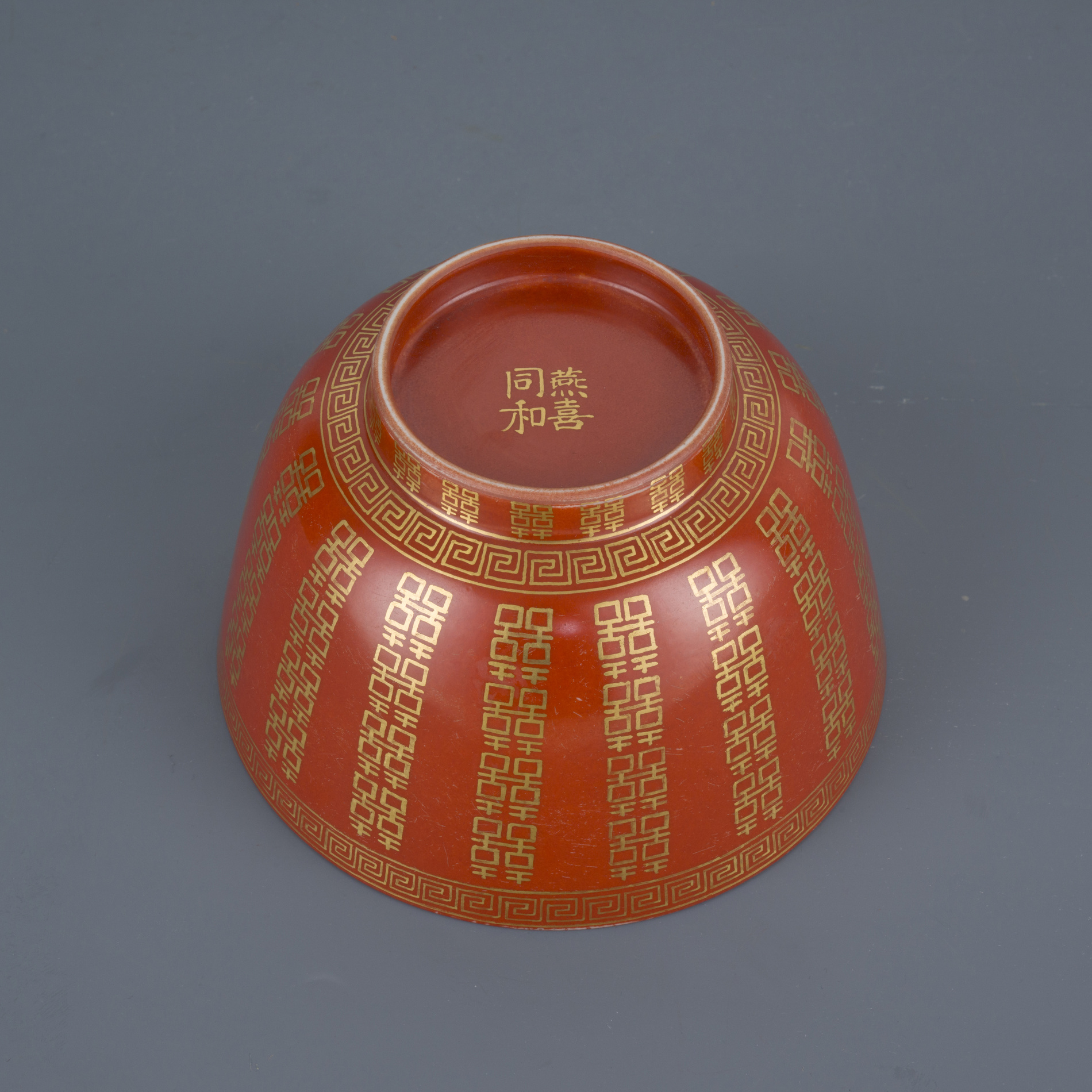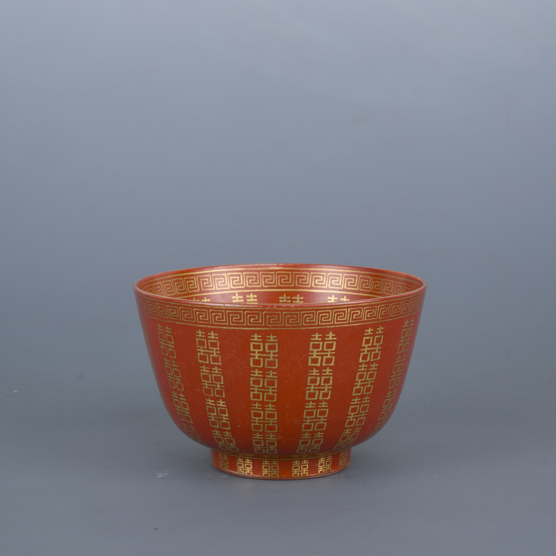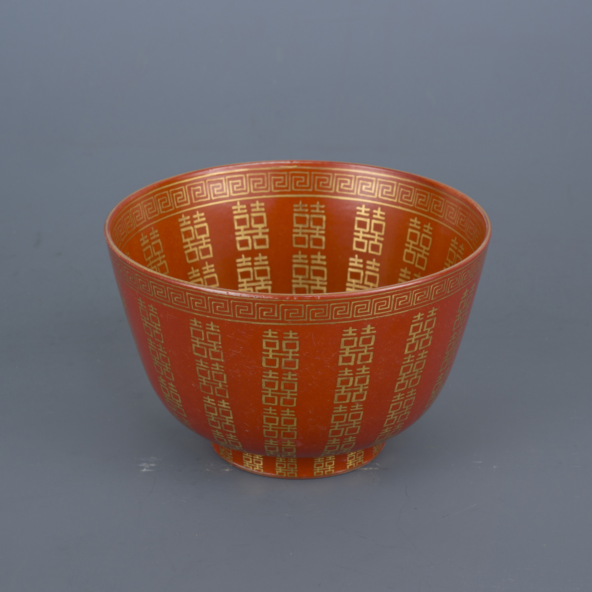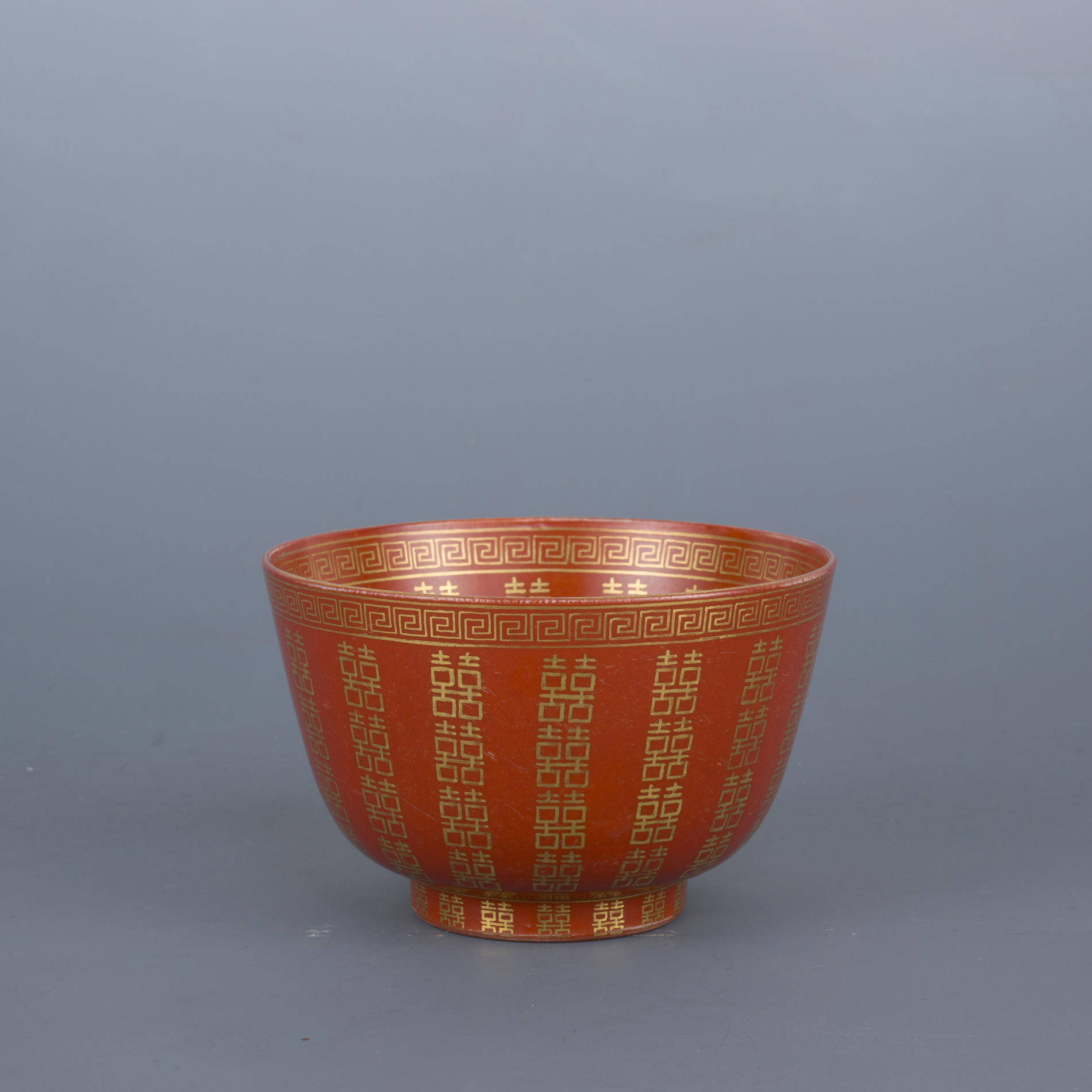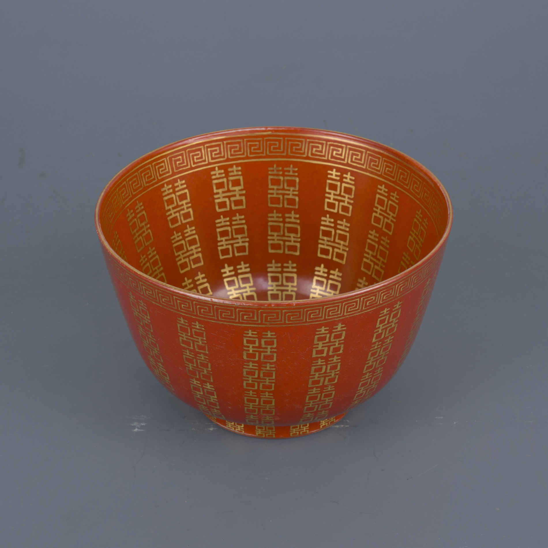 Porcellana rosso corallo, decoro a ideogrammi oro