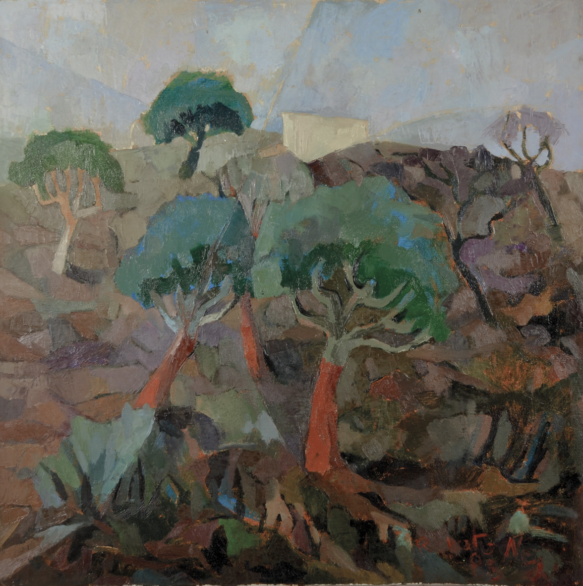 NESI RENATO Treviso 1923 - 2004 Paesaggio collinare 1985 olio su tela 60x60 firma e data in basso a destra