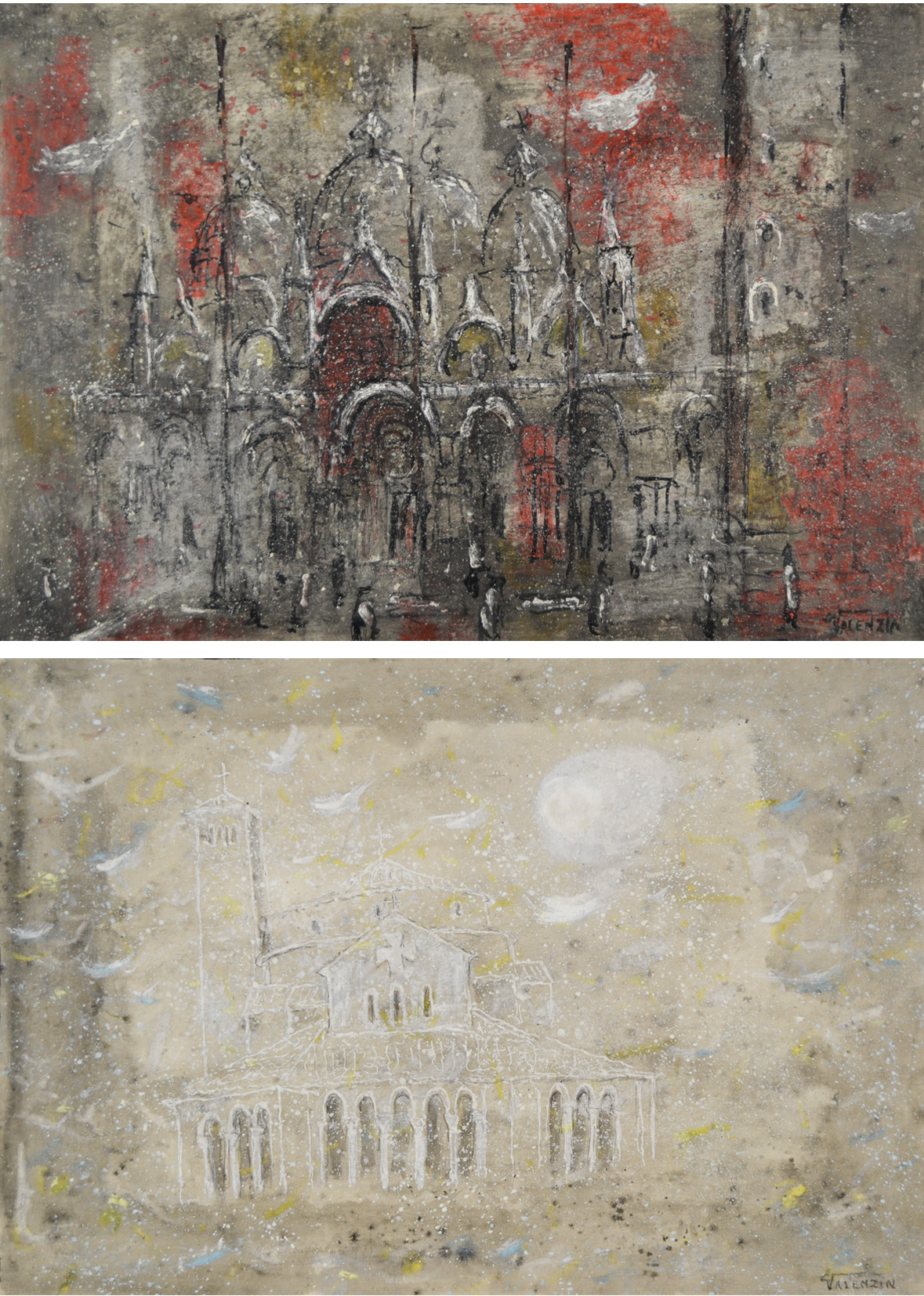 VALENZIN GIORGIO Pordenone 1901 - Venezia 1978 San Marco - Torcello lotto di 2 encausti su cartone 33x48 cad. entrambi firmati in basso a destra dedica ad personam al retro Galleria d'Arte La Riviera Treviso - etichetta al retro