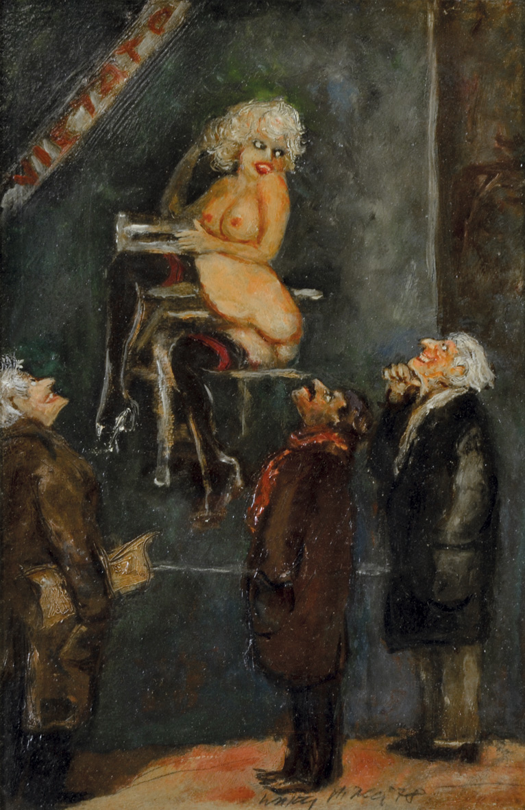 PIACESI WALTER Ascoli Piceno 1929 Pubblicità erotica contemporanea 1978 olio su tavola 30x20 firma e data in basso a destra, firma data titolo e dedica ad personam al retro parere verbale favorevole del dott. Paolo Piacesi esposizioni: Galleria d'Arte Onas Bolzano - timbro al retro