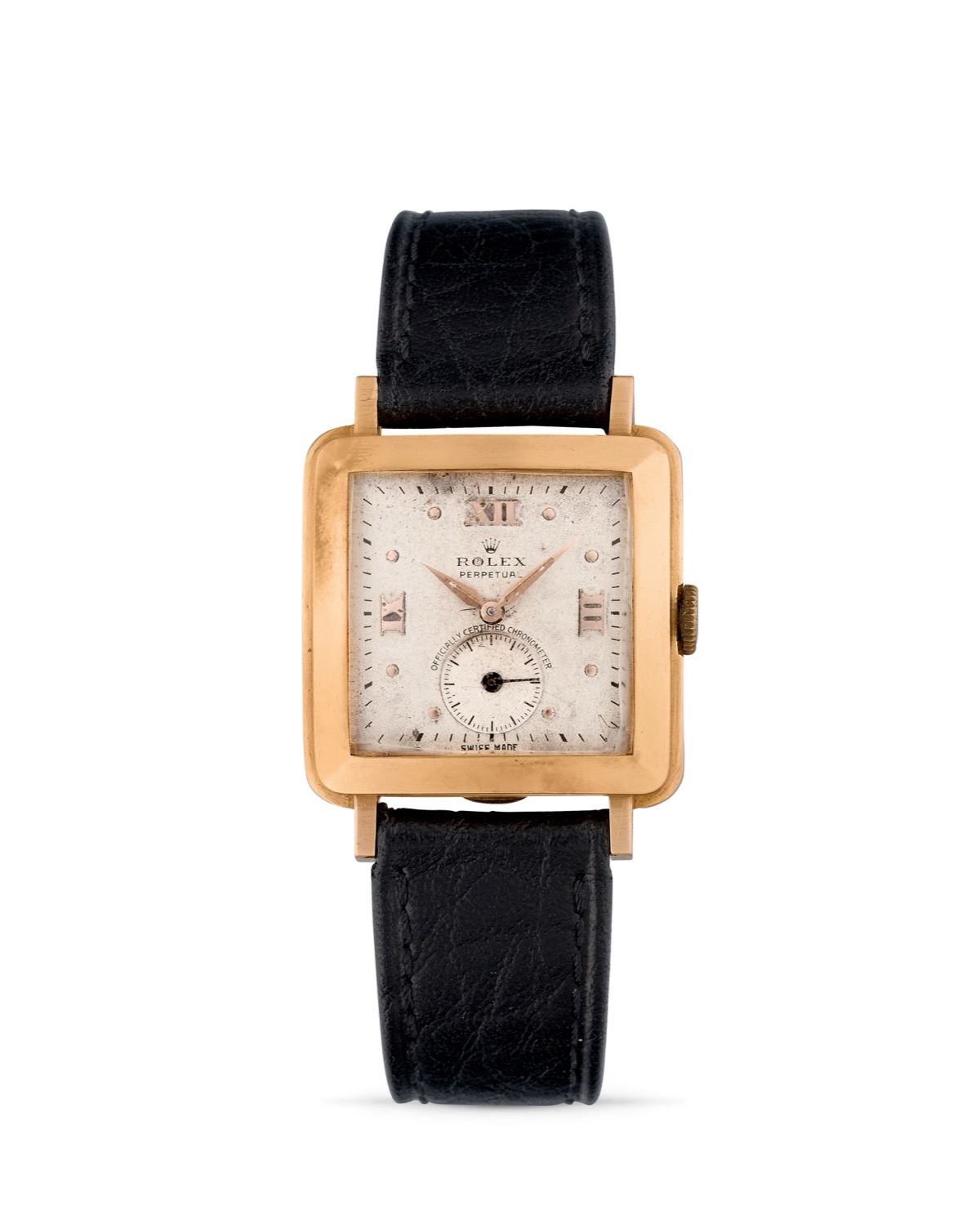 Cinturino in pelle e fibbia Rolex placcata oro.