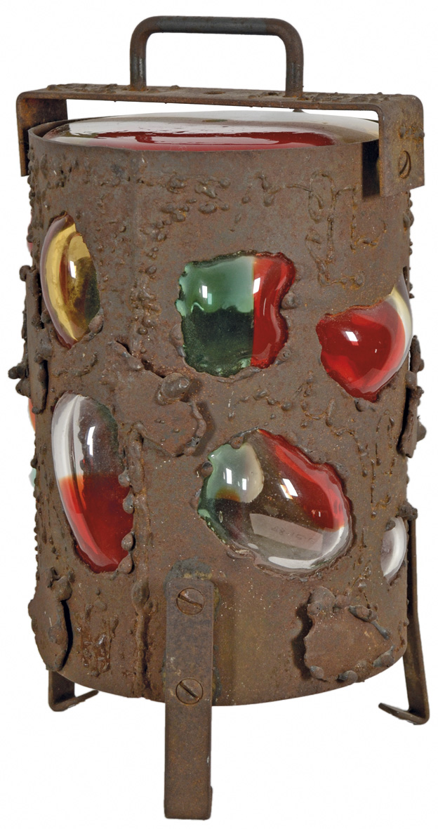 VIANELLO VINICIO Venezia 1923 - 1999 Lanterna medioevale 1968 scultura in vetro colorato a macchie soffiato in ferro dolce 35x20 bibliografia: "Vinicio Vianello" Pittura, vetro e design a cura Luca Massimo Barbero ed. Skira pag. 178