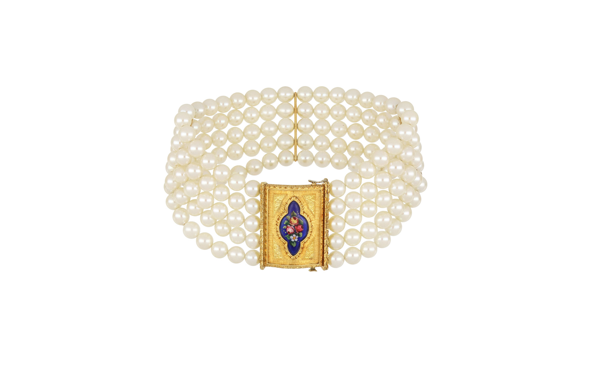 Bracciale a 5 fili di perle giapponesi coltivate 5 30 mm di diametro chiuso da una fermatura in oro giallo miniata a motivo floreale e delicatamente incisa.