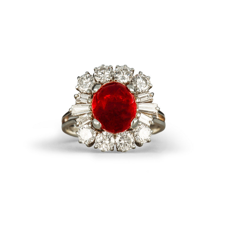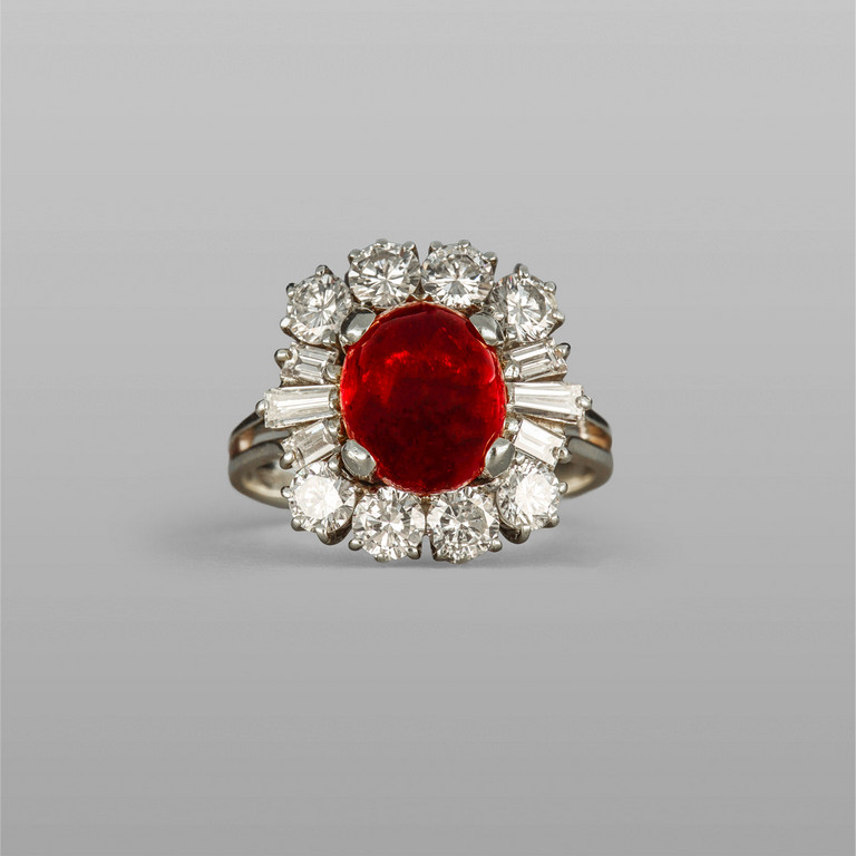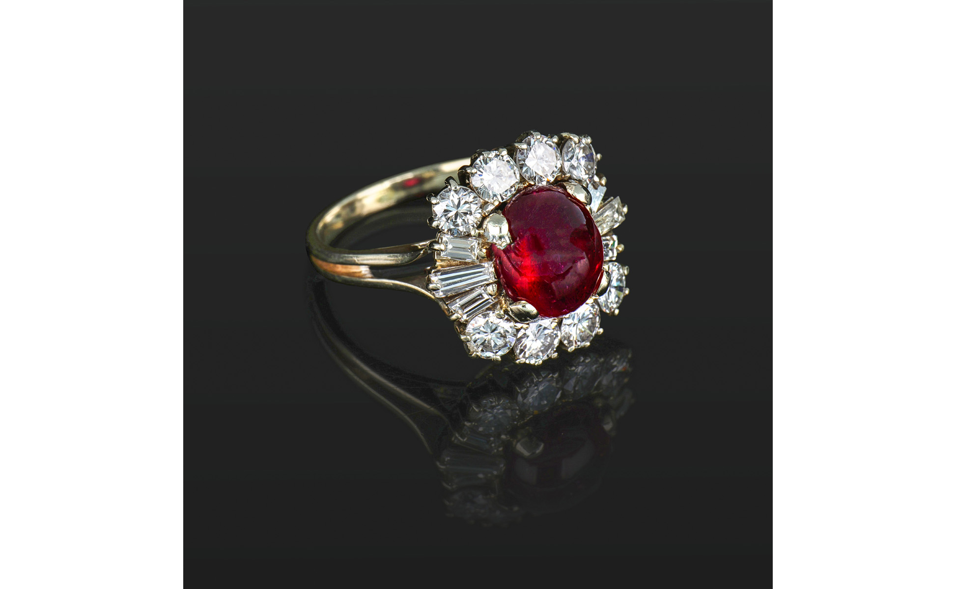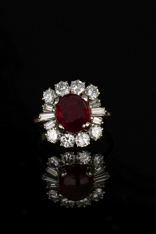 Classico anello in oro bianco con rubino taglio ovale cabochon di ct. 3 40 ca. la gemma incastonata al centro è contornata da diamanti taglio brillante e taper per ct. 1 40 ca.