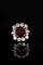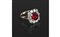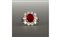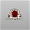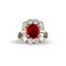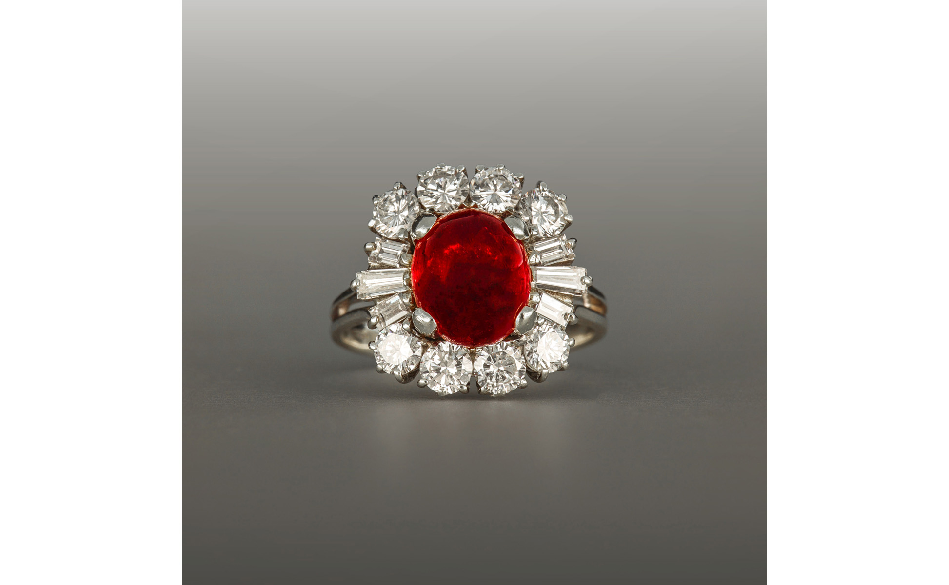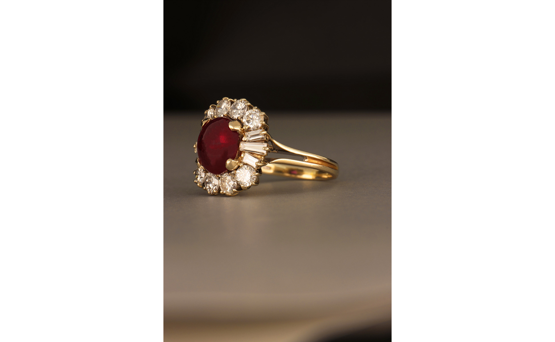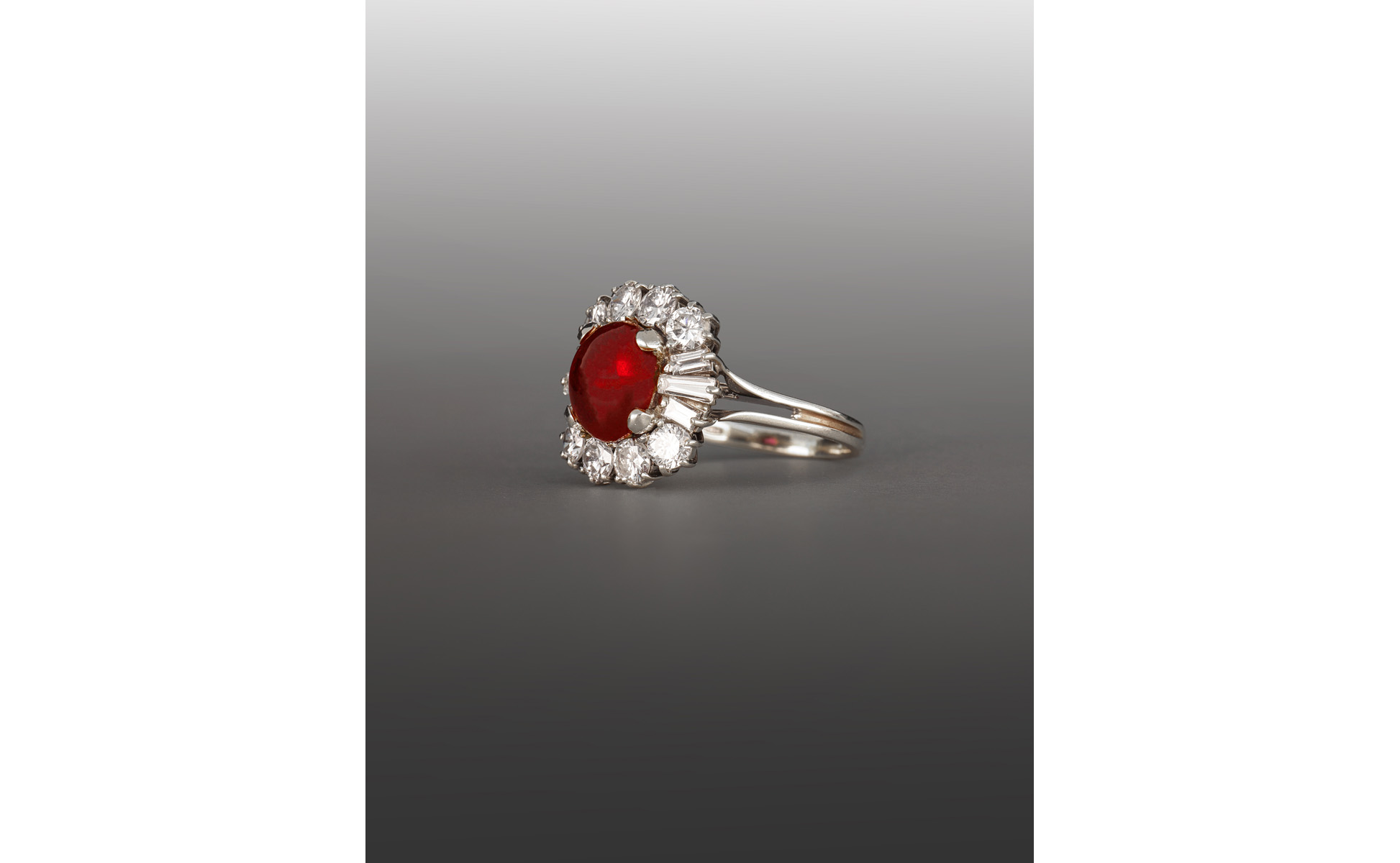 Classico anello in oro bianco con rubino taglio ovale cabochon di ct. 3 40 ca. la gemma incastonata al centro è contornata da diamanti taglio brillante e taper per ct. 1 40 ca.