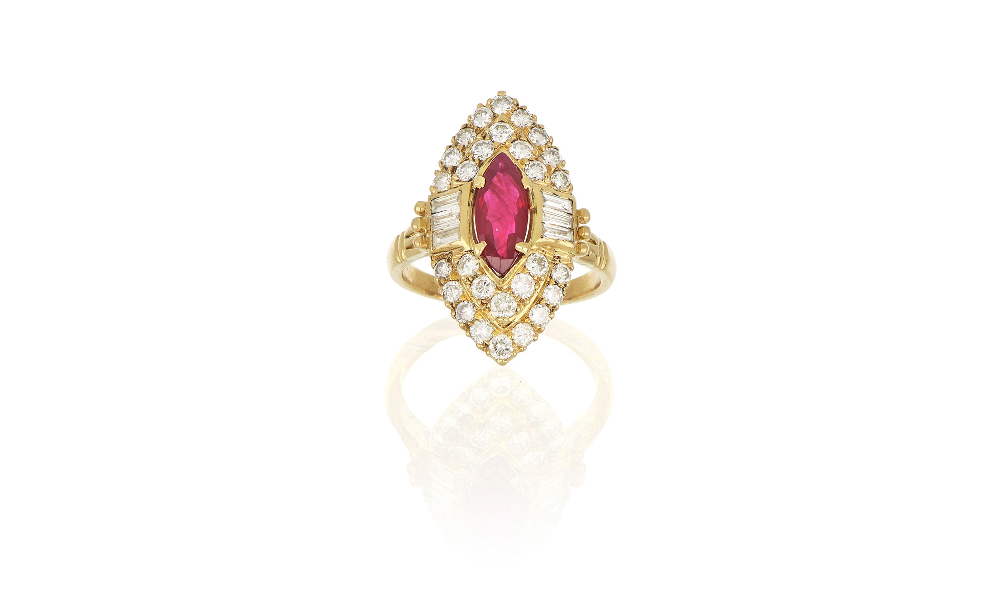 Anello in oro giallo a figaro la particolare forma slanciata è arricchita da un rubino taglio navette di ct. 1 50 ca. e doppio contorno di diamanti taglio brillante e taper per ct. 1 0 ca.