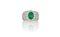 Anello a fascia bombata in oro bianco sormontato da uno smeraldo taglio ovale di ct. 2 0 ca. decorato con piccoli diamanti taglio brillante per ct. 2 0 ca.