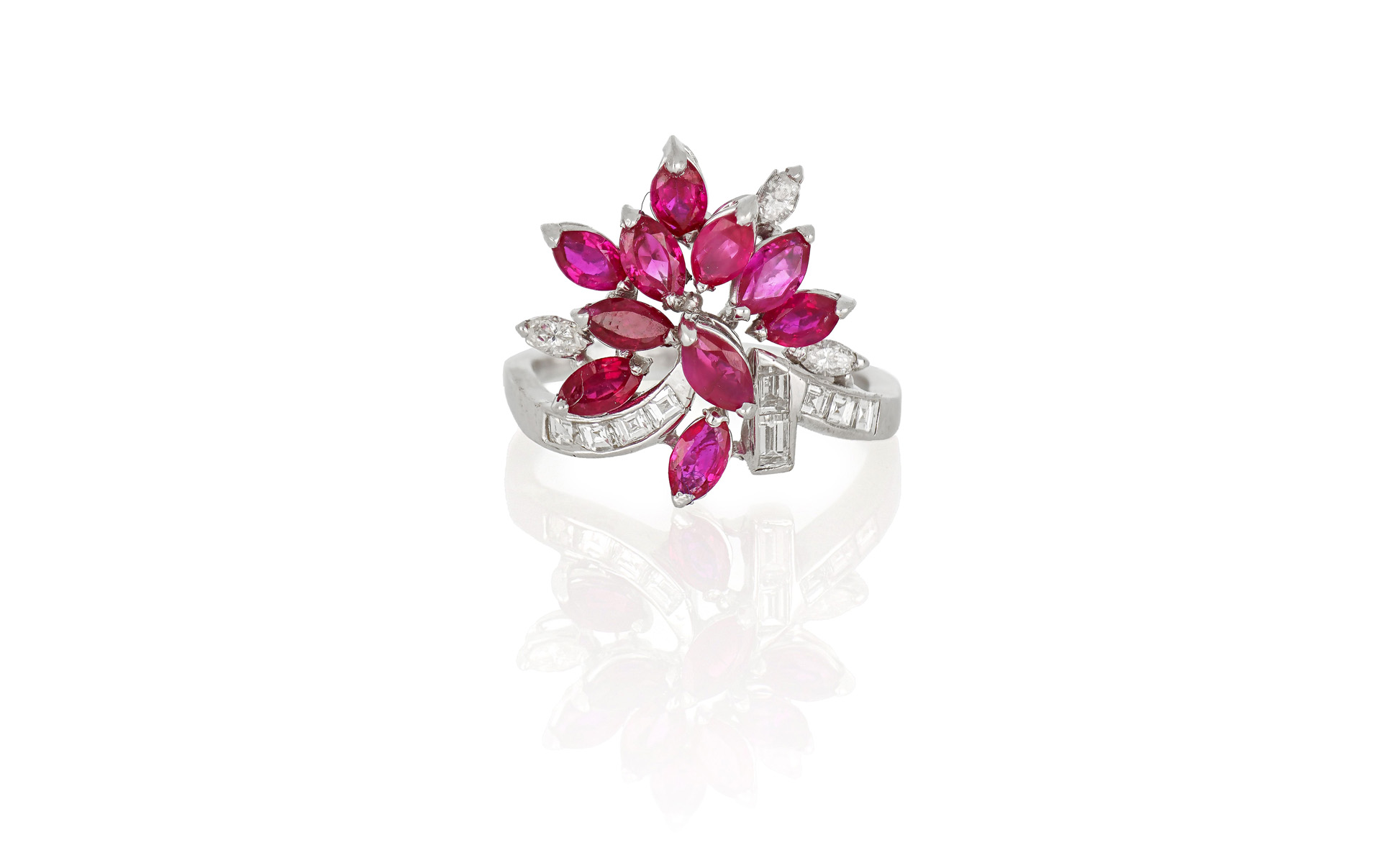 Anello in oro bianco da cocktail 10 rubini birmani non riscaldati taglio navette per ct. 2 50 ca. si mescolano a diamanti di diverso taglio in questa fantasiosa composizione.