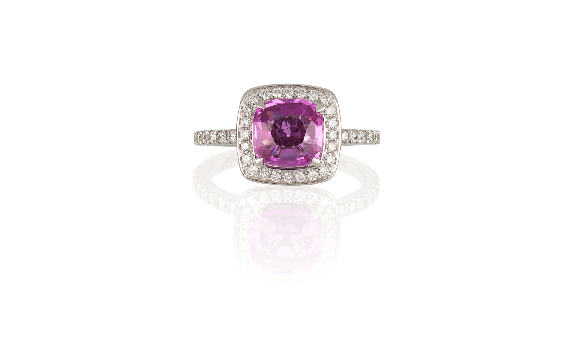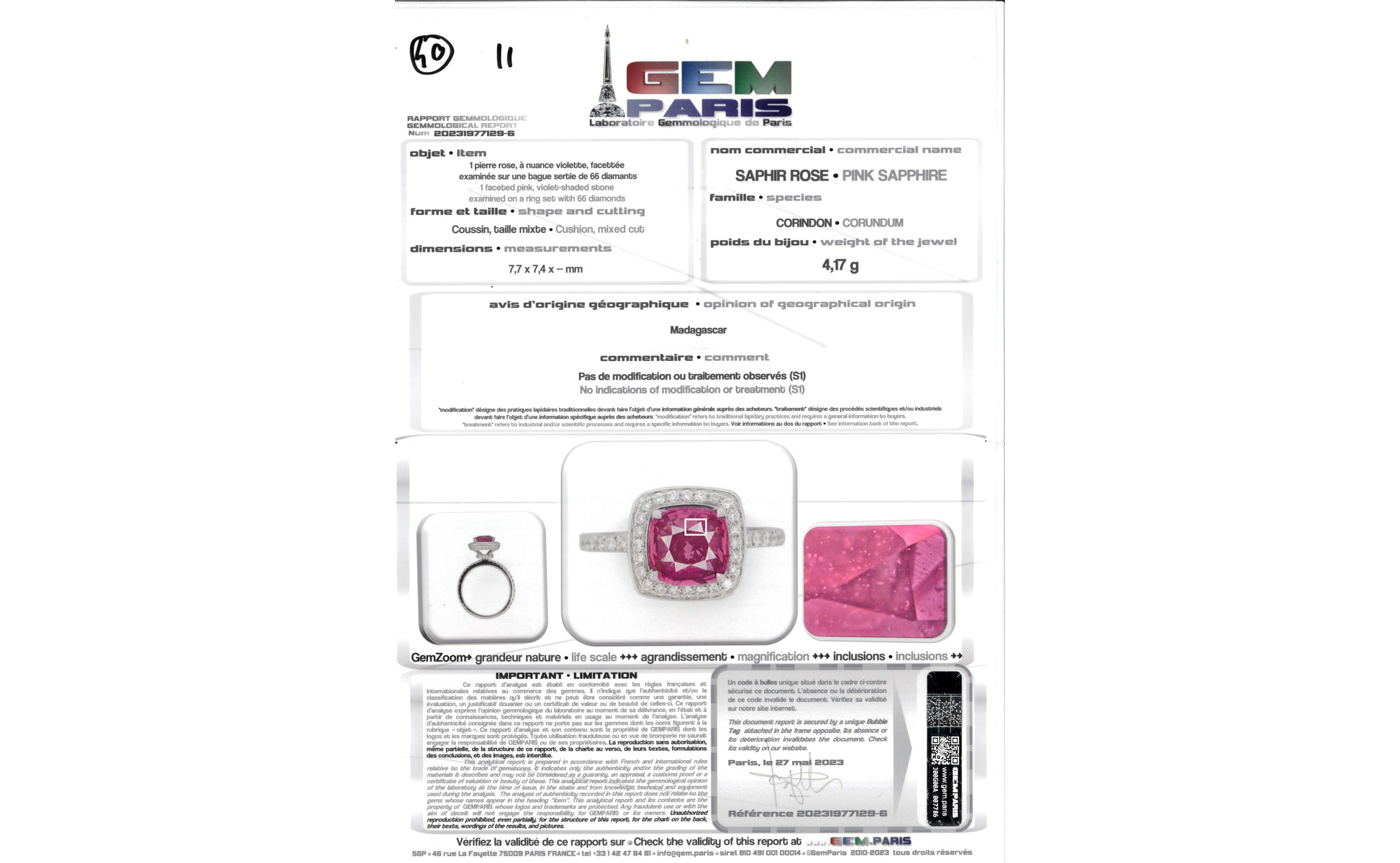 Anello halo in oro bianco con diamanti tondi per stimati 0 30 ct contenente al centro uno zaffiro rosa a cuscino di stimati 2 ct accompagnato da report gemmologico GEM Paris attestante l'origine Madagascar e l'assenza di trattamento termico.