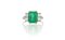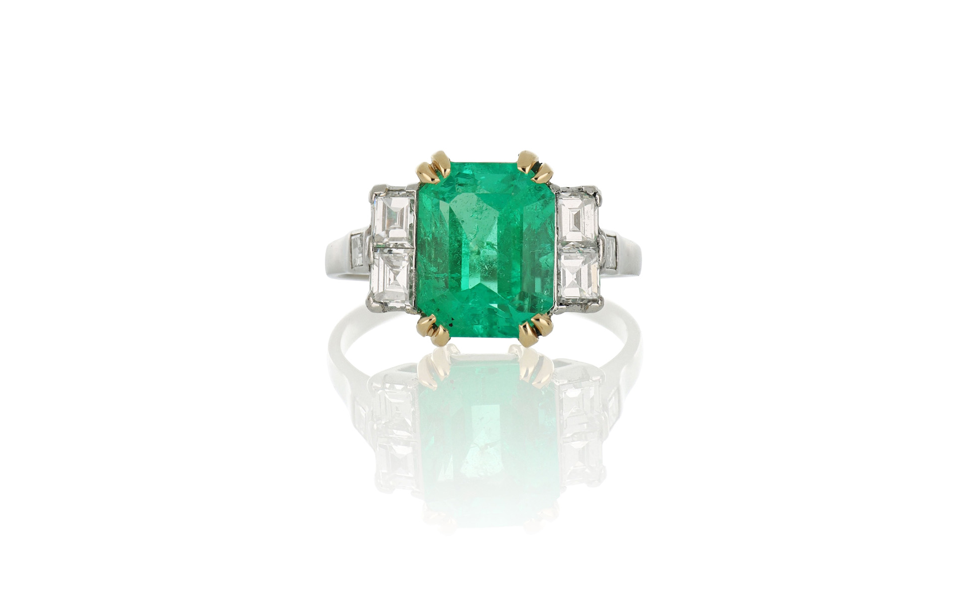 Anello in platino con 6 diamanti di contorno con taglio a gradini per stimati 1 10 ct complessivi e smeraldo centrale colombiano di bella trasparenza e vivacità di stimati 4 20 ct.ù