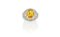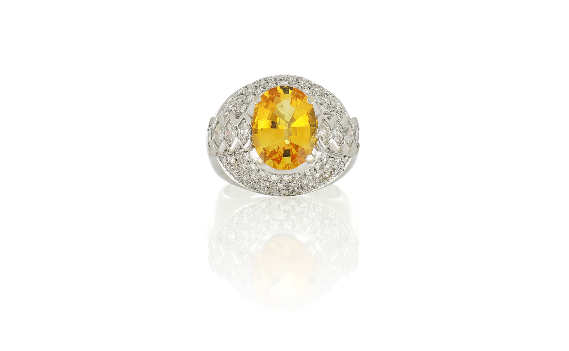 Grande anello a musone con pavè di diamanti taglio a brillante nella forma rotonda e a navette per stimati 2 ct complessivi recante grande zaffiro giallo di forma ovale di stimati 7/8 ct.