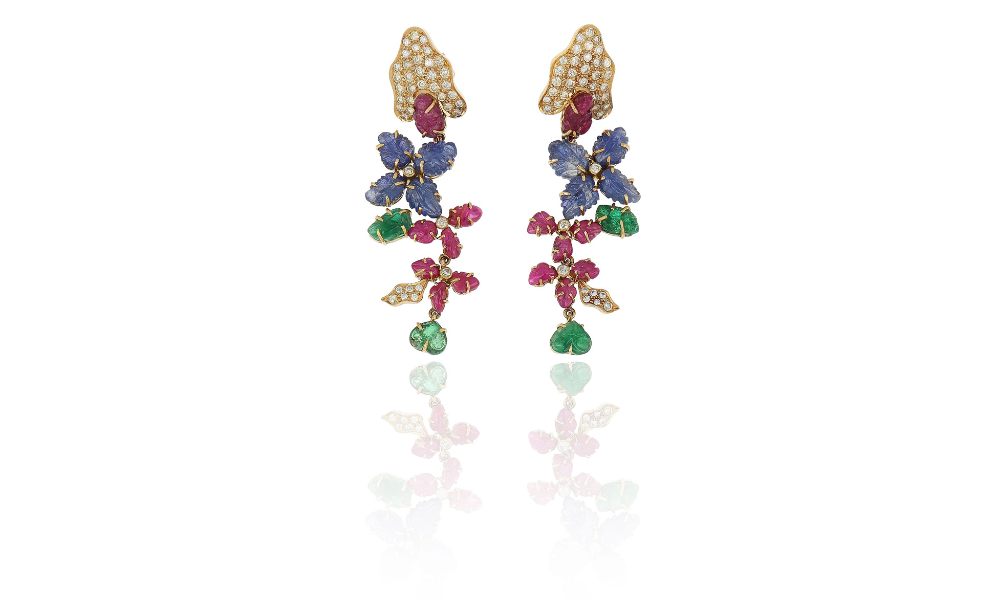Orecchini pendenti in oro giallo a motivo floreale con rubini zaffiri smeraldi su foliage carved e diamanti a pavè sui lobi.