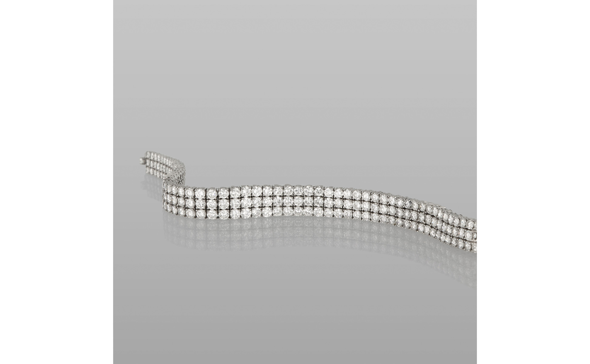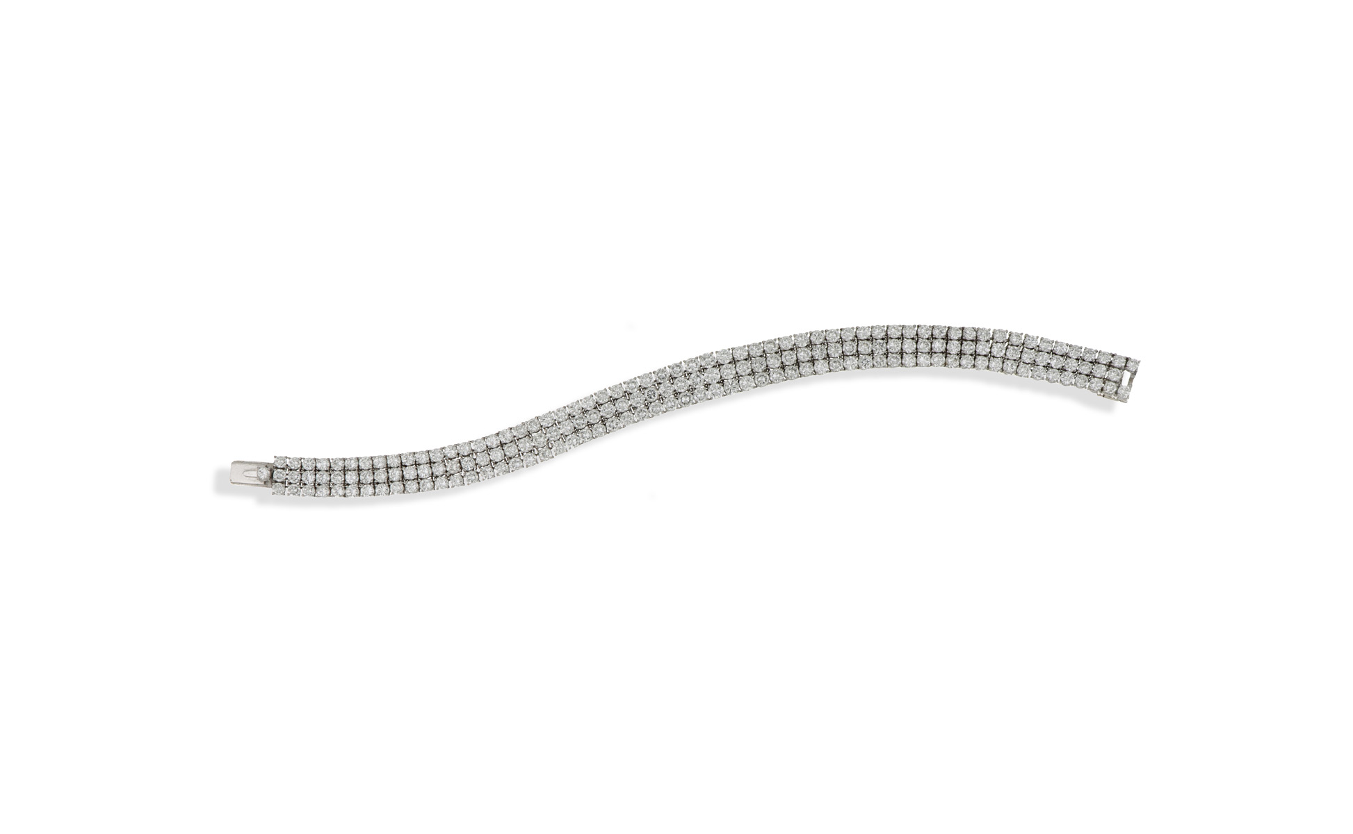 Bracciale in platino tre file di diamanti taglio brillante leggermente scalati sui lati per ct. 22 0 ca. si snodano morbidi al polso.