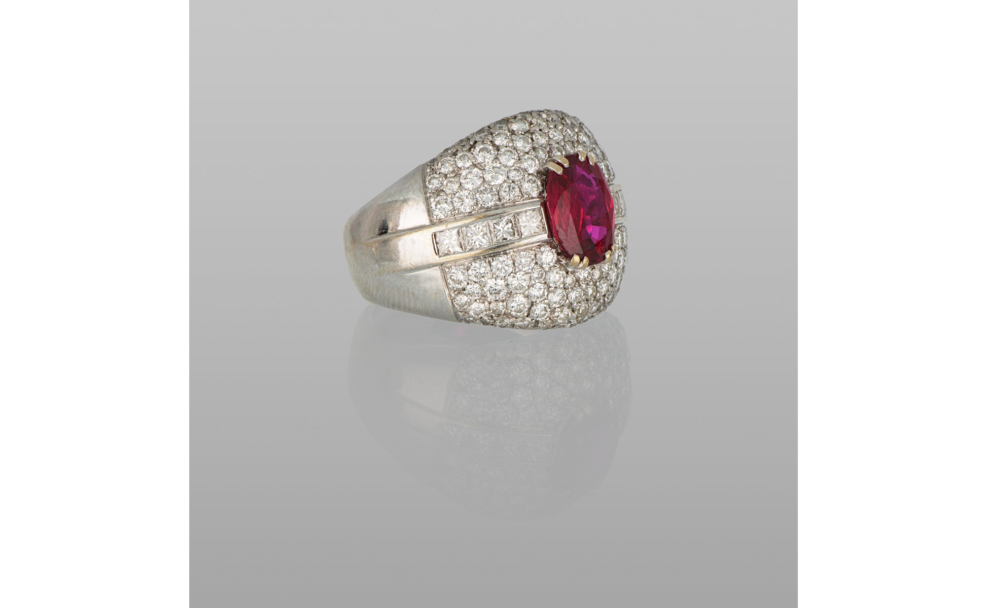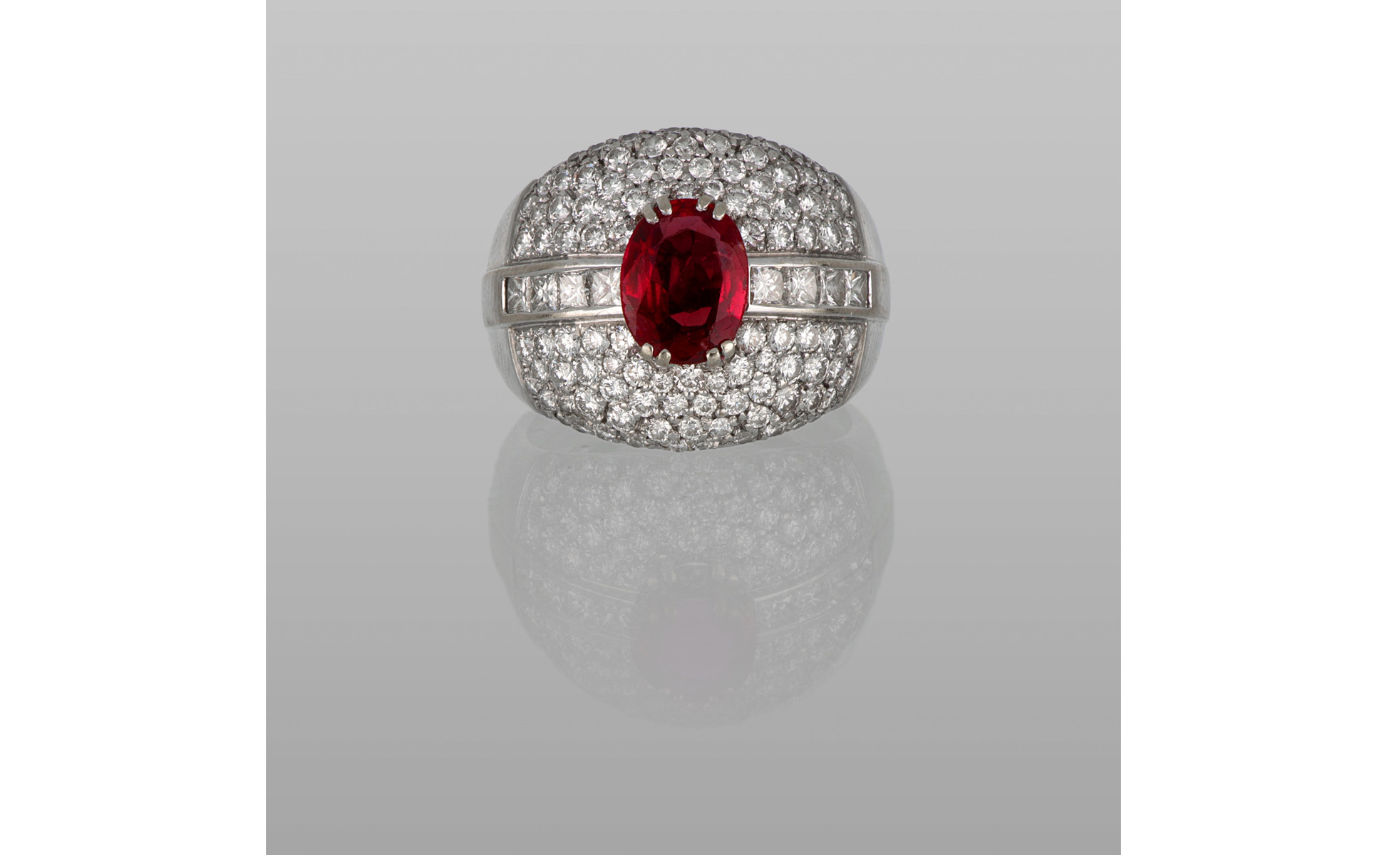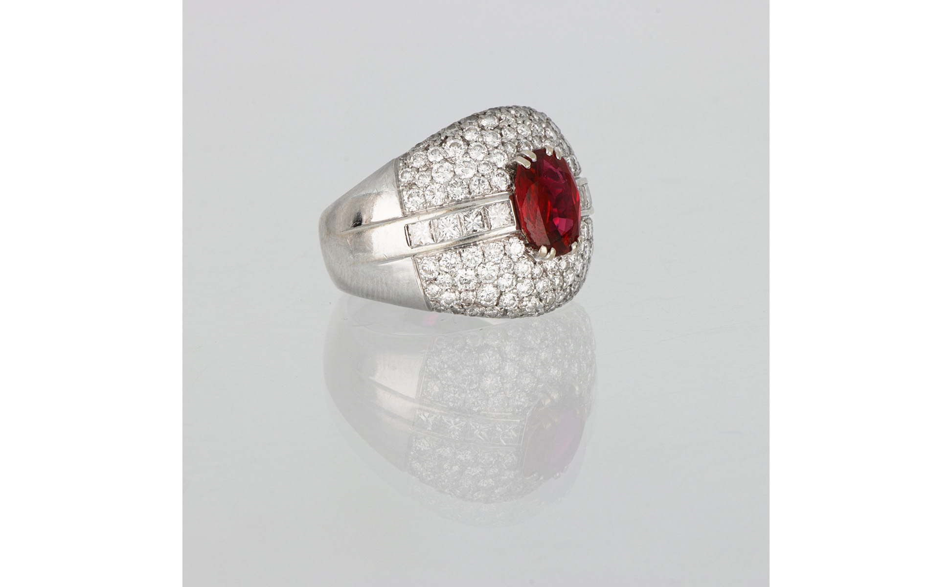 Grande anello a fascia in oro bianco un fine e limpido rubino taglio ovale di ct. 3 0 ca. è incastonato al centro di questo grande pavè diamanti taglio brillante e princess per ct. 3 0 ca.